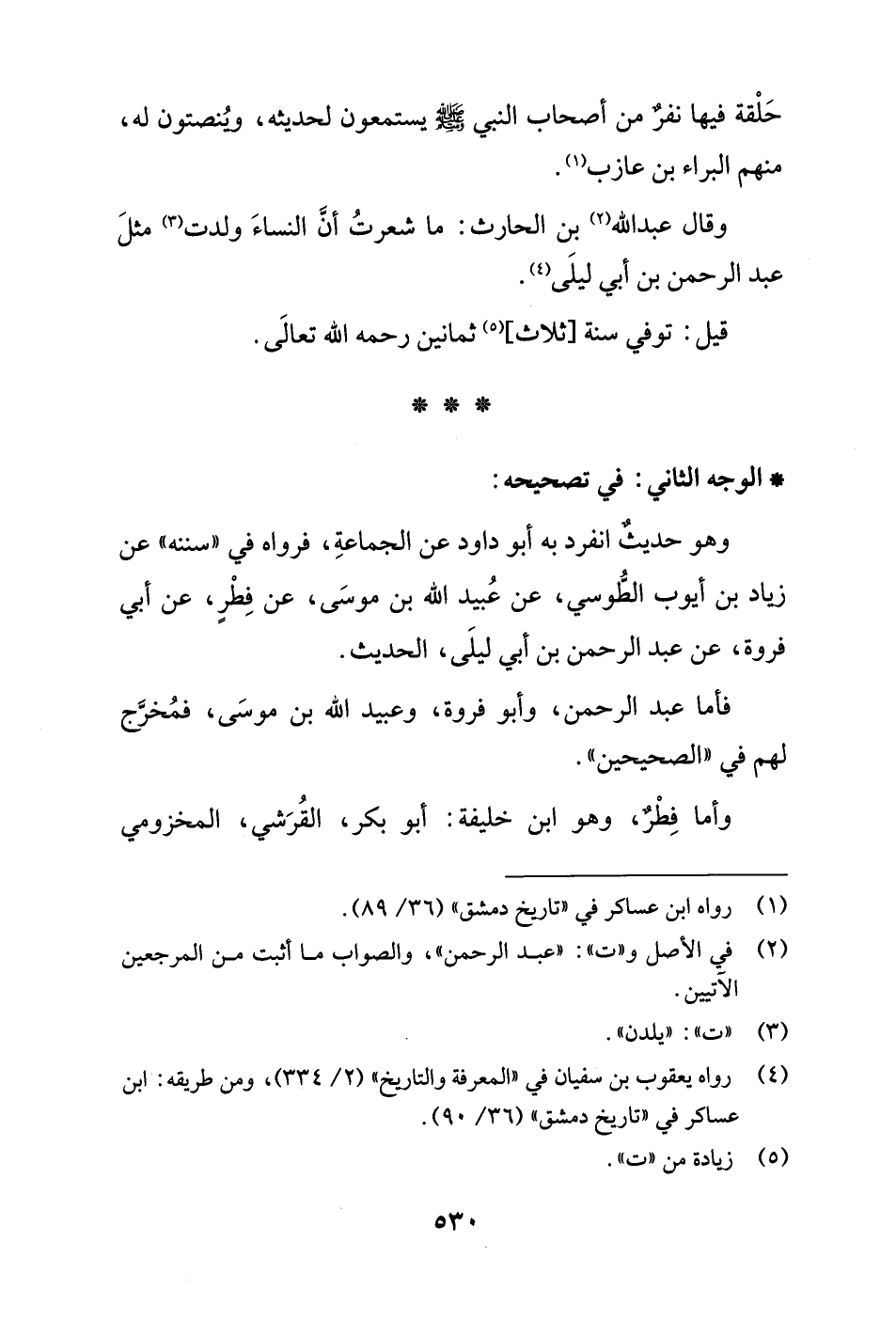 وهو حديثٌ انفرد به أبو داود عن الجماعةِ، فرواه في "سننه" عن زياد بن أيوب الطُّوسي، عن عُبيد الله بن موسَى، عن فِطْرٍ، عن أبي فروة، عن عبد الرحمن بن أبي ليلَى، الحديث.