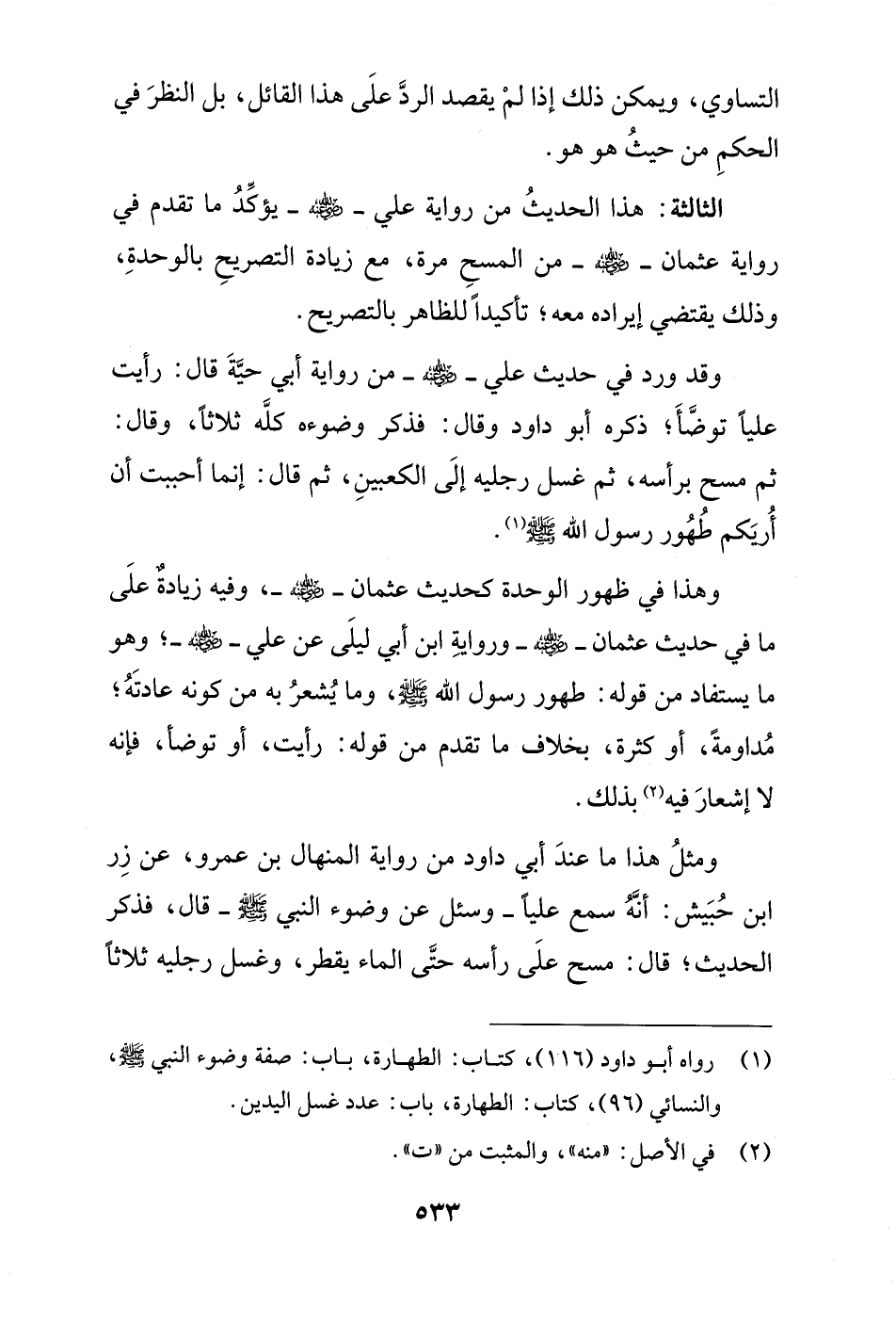 ومثلُ هذا ما عندَ أبي داود من رواية المنهال بن عمرو، عن زِر ابن حُبَيش: أنَّهُ سمع عليًا - وسئل عن وضوء النبي - صلى الله عليه وسلم - قال، فذكر الحديث؛ قال: مسح علَى رأسه حتَّى الماء يقطر، وغسل رجليه ثلاثًا