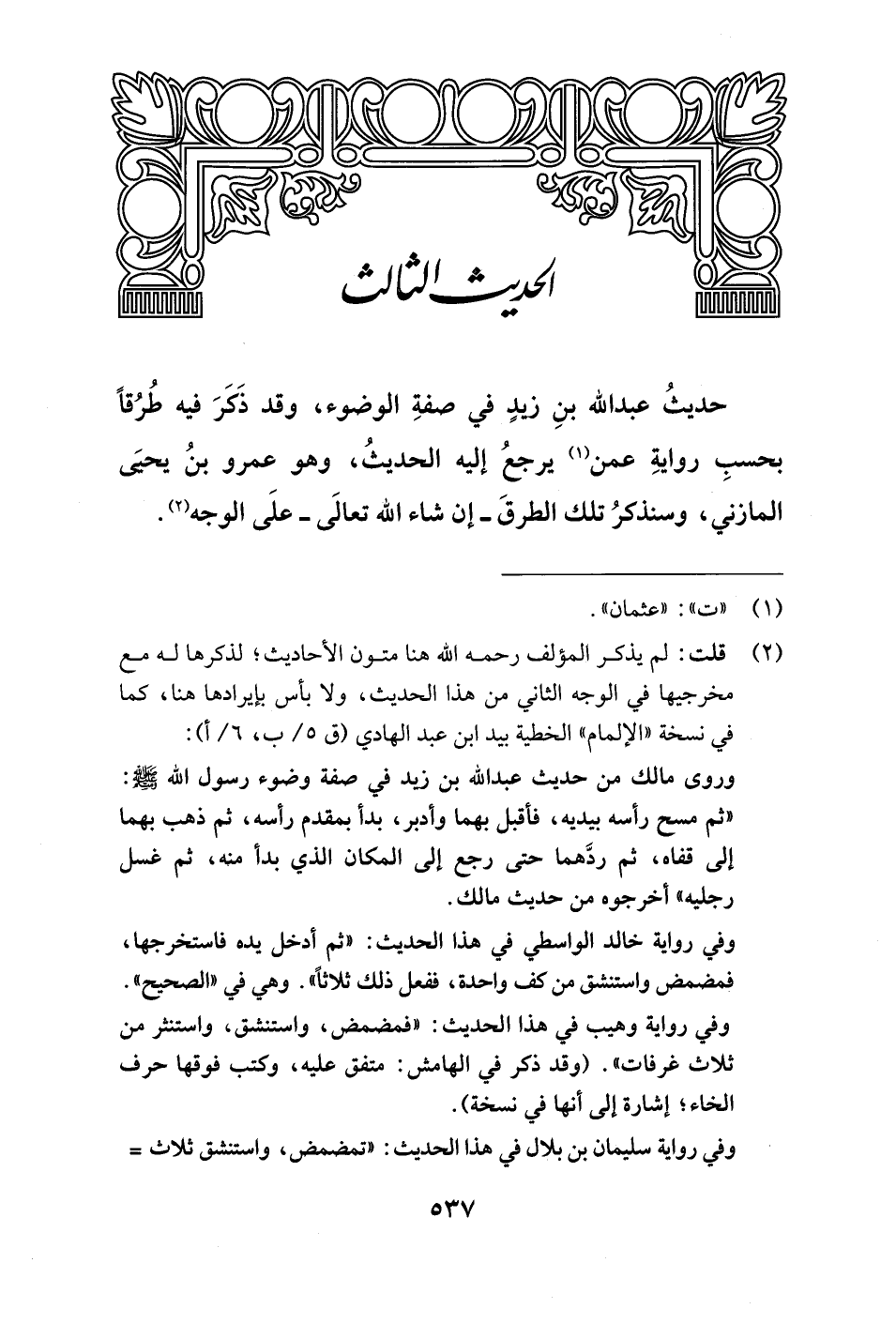 حديثُ عبد الله بنِ زبدٍ في صفةِ الوضوء، وقد ذَكَرَ فيه طُرُقاً بحسبِ روايةِ عمن (¬1) يرجعُ إليه الحديثُ، وهو عمرو بنُ يحيىَ المازني، وسنذكرُ تلك الطرقَ - إن شاء الله تعالَى - علَى الوجه (¬2).
