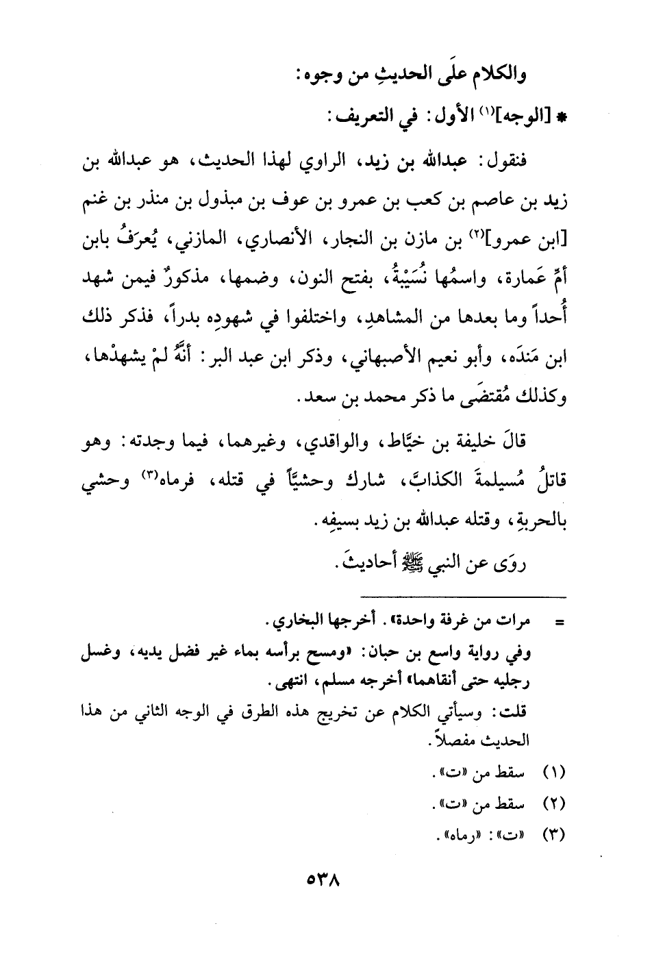 فنقول: عبد الله بن زيد، الراوي لهذا الحديث، هو عبد الله بن زيد بن عاصم بن كعب بن عمرو بن عوف بن مبذول بن منذر بن غنم [ابن عمرو] (¬2) بن مازن بن النجار، الأنصاري، المازني، يُعرَفُ بابن أمّ عَمارة، واسمُها نُسَيْبةُ، بفتح النون، وضمها، مذكورٌ فيمن شهد أُحداً وما بعدها من المشاهدِ، واختلفوا في شهودِه بدرًا، فذكر ذلك ابن مَندَه، وأبو نعيم الأصبهاني، وذكر ابن عبد البر: أنَّهُ لمْ يشهدْها، وكذلك مُقتضَى ما ذكر محمد بن سعد.