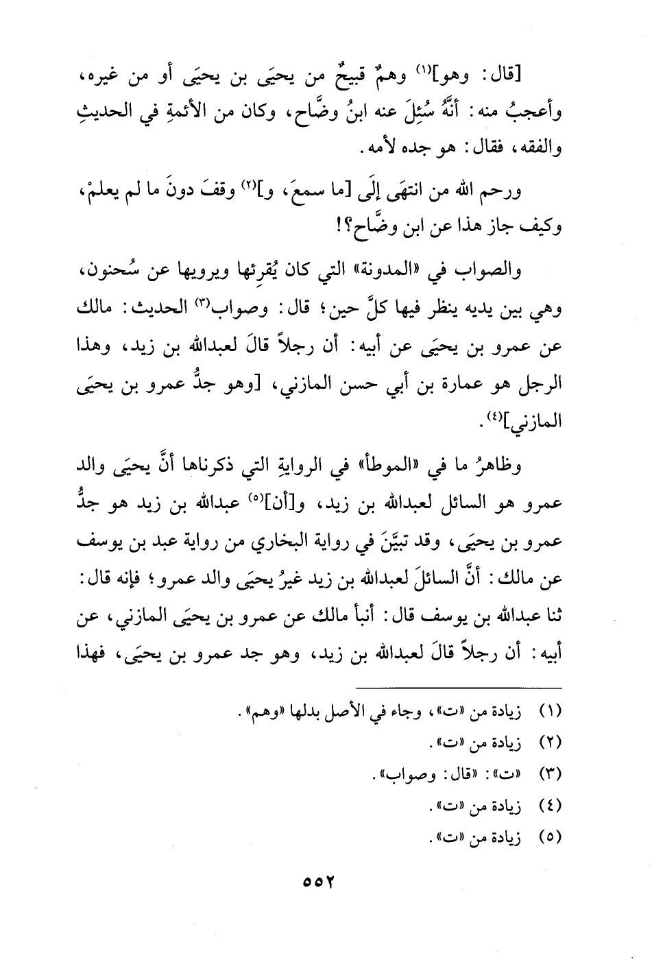 والصواب في "المدونة" التي كان يُقرِئها ويرويها عن سُحنون، وهي بين يديه ينظر فيها كلَّ حين؛ قال: وصواب (¬3) الحديث: مالك عن عمرو بن يحيىَ عن أبيه: أن رجلًا قالَ لعبد الله بن زيد، وهذا الرجل هو عمارة بن أبي حسن المازني، [وهو جدّ عمرو بن يحيىَ المازني] (¬4).