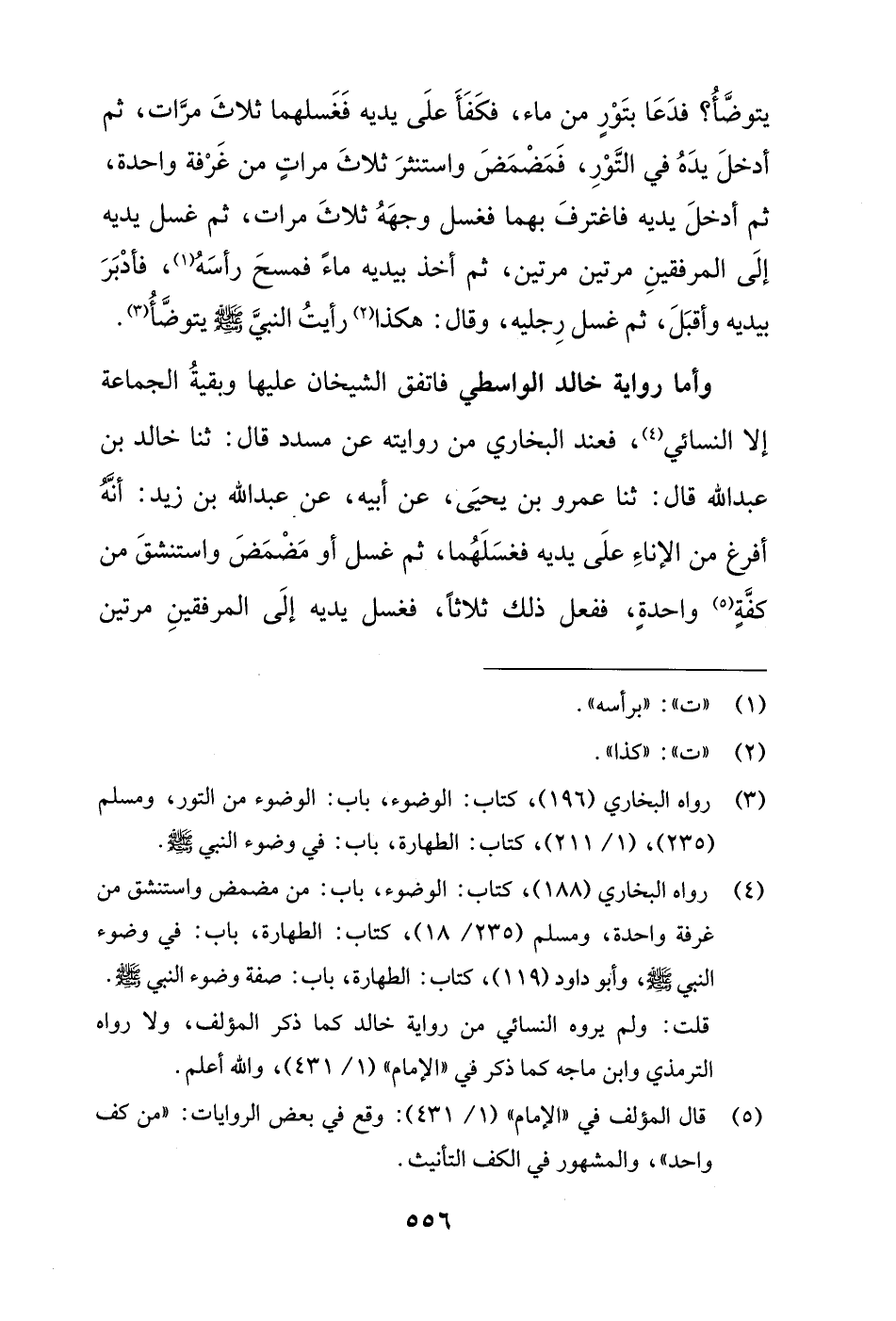 وأما رواية خالد الواسطي فاتفق الشيخان عليها وبقيةُ الجماعة إلا النَّسائيُّ (¬4)، فعند البخاري من روايته عن مسدد قال: ثنا خالد بن عبد الله قال: ثنا عمرو بن يحيَى، عن أبيه، عن عبد الله بن زيد: أنَّهُ أفرغ من الإناءِ علَى يديه فغسَلَهُما، ثم غسل أو مَضْمَضَ واستنشقَ من كفَّةٍ (¬5) واحدةٍ، ففعل ذلك ثلاثًا، فغسل يديه إلَى المرفقينِ مرتين