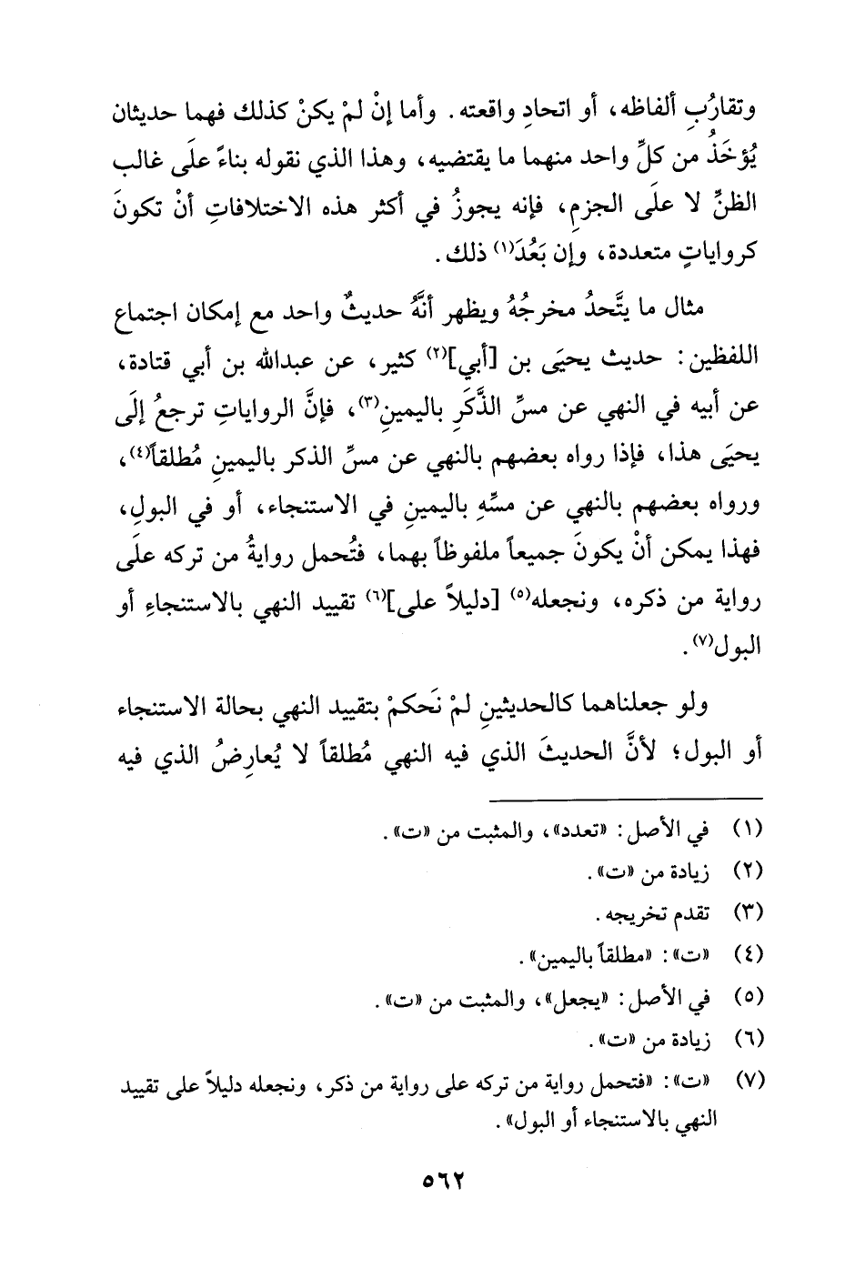 (¬7) "ت": "فتحمل رواية من تركه على رواية من ذكر، ونجعله دليلاً على تقييد النهي بالاستنجاء أو البول".