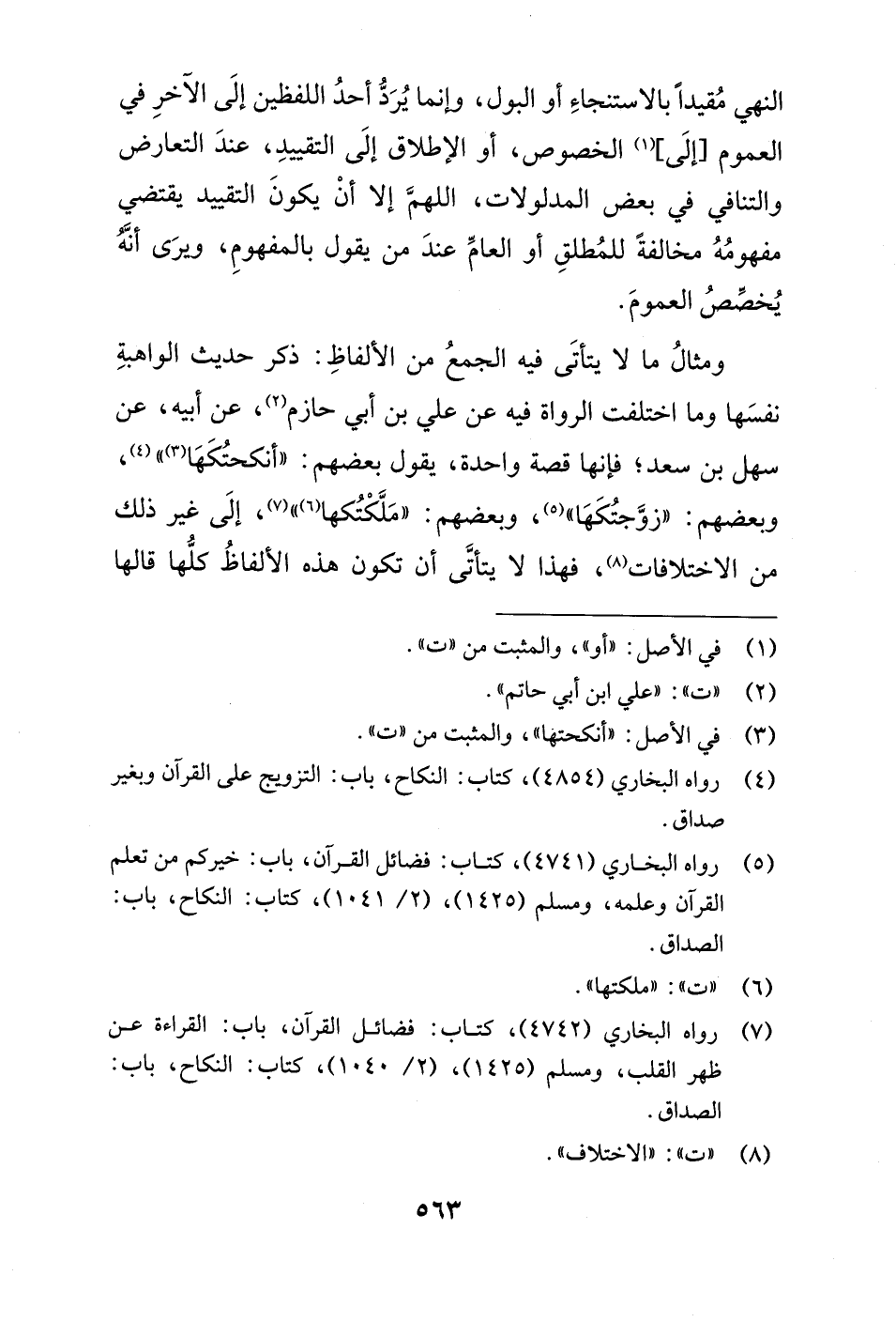 ومثالُ ما لا يتأتَى فيه الجمعُ من الألفاظِ: ذكر حديث الواهبةِ نفسَها وما اختلفت الرواة فيه عن علي بن أبي حازم (¬2)، عن أبيه، عن سهل بن سعد؛ فإنها قصة واحدة، يقول بعضهم: "أنكحتُكَهَا (¬3) " (¬4)، وبعضهم: "زوَّجتُكَهَا" (¬5)، وبعضهم: "مَلَّكْتُكها (¬6) " (¬7)، إلَى غير ذلك من الاختلافات (¬8)، فهذا لا يتأتَّى أن تكون هذه الألفاظُ كلُّها قالها