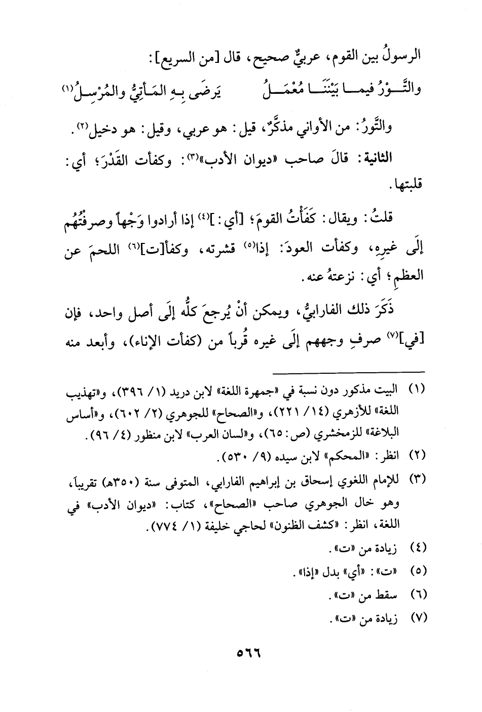 ذَكَرَ ذلك الفارابيُّ، ويمكن أنْ يُرجعَ كلُّه إلَى أصل واحد، فإن [في] (¬7) صرفِ وجههم إلَى غيره قُرباً من (كفأت الإناء)، وأبعد منه