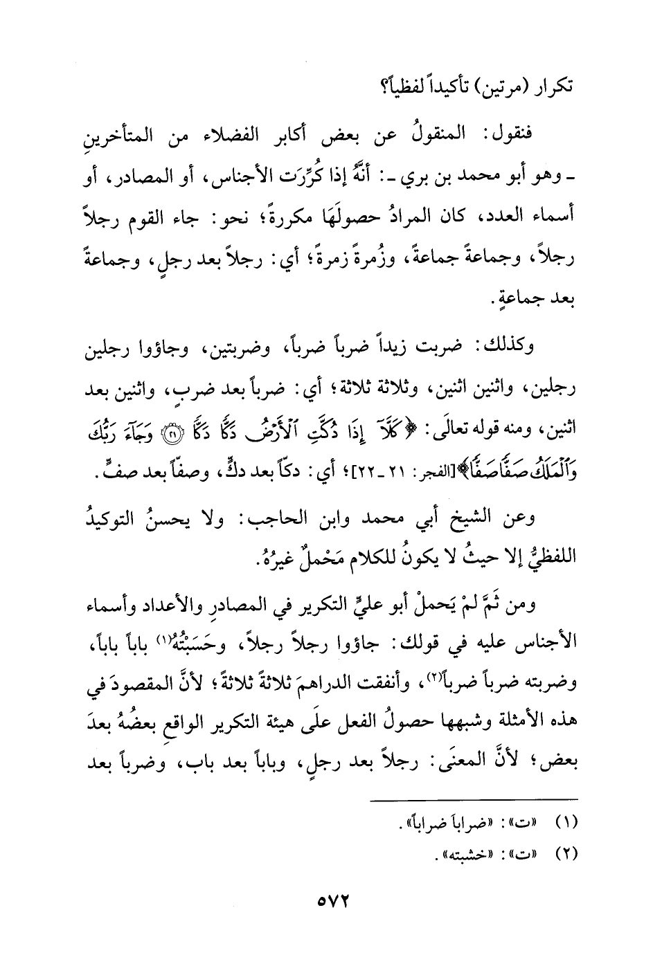 وكذلك: ضربت زيداً ضرباً ضرباً، وضربتين، وجاؤوا رجلين رجلين، واثنين اثنين، وثلاثة ثلاثة؛ أي: ضرباً بعد ضربٍ، واثنين بعد اثنين، ومنه قوله تعالَى: {كَلَّا إِذَا دُكَّتِ الْأَرْضُ دَكًّا دَكًّا (21) وَجَاءَ رَبُّكَ وَالْمَلَكُ صَفًّا صَفًّا} [الفجر: 21 - 22]؛ أي: دكًّا بعد دكٍّ، وصفًّا بعد صفٍّ.