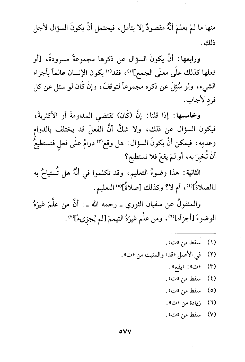 وخامسها: إذا قلنا: إنَّ (كَان) تقتضي المداومةَ أو الأكثريةَ، فيكون السؤال عن ذلك، ولا شكَّ أنَّ الفعلَ قد يختلف بالدوامِ وعدمِه، فيمكن أنْ يكونَ السؤال: هل وقع (¬3) دوامٌ علَى فعلٍ فتستطيعُ أنْ تُخبِرَ به، أو لمْ يقعْ فلا تستطيع؟