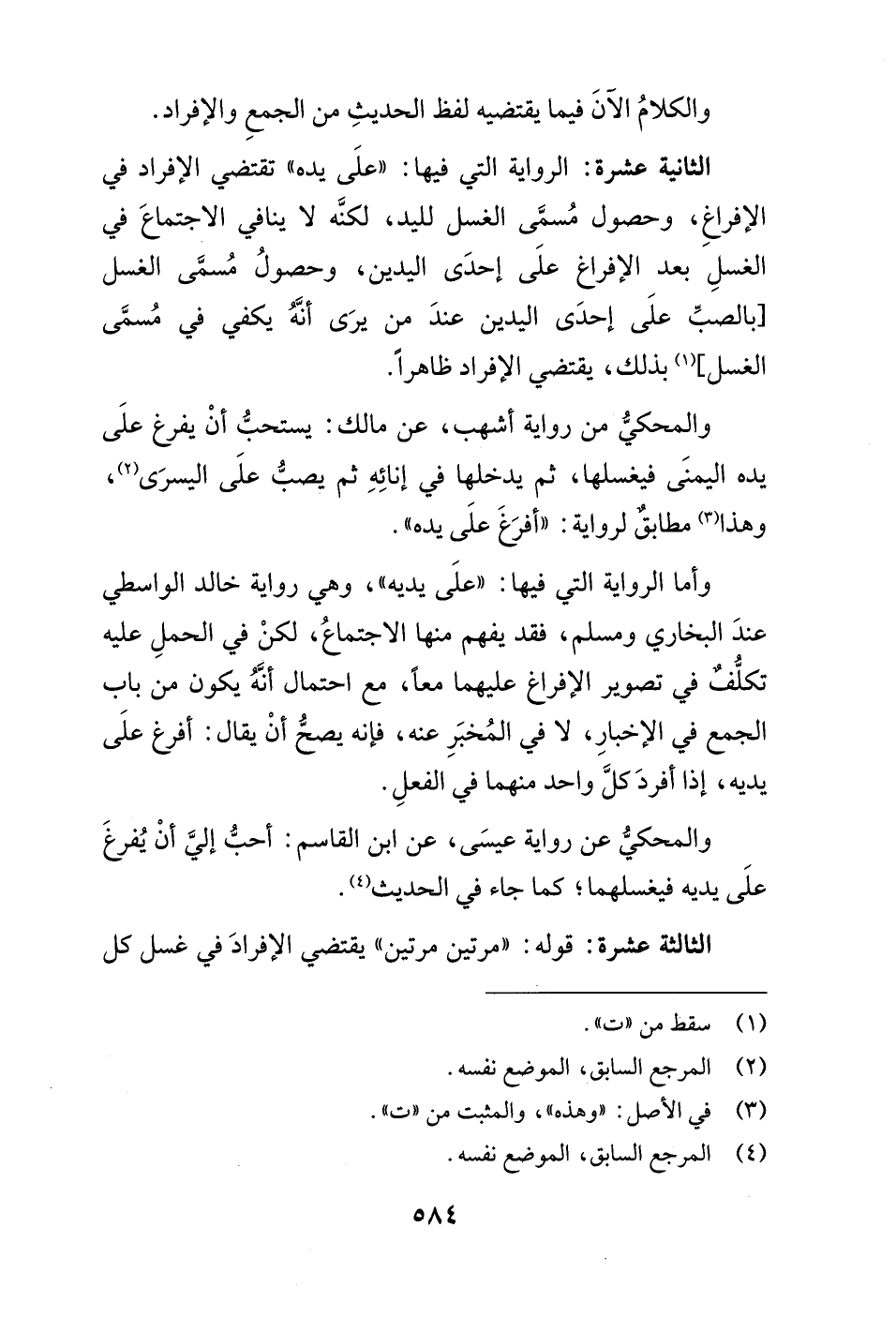 الثانية عشرة: الرواية التي فيها: "علَى يده" تقتضي الإفراد في الإفراغِ، وحصول مُسمَّى الغسل لليد، لكنَّه لا ينافي الاجتماعَ في الغسلِ بعد الإفراغ علَى إحدَى اليدين، وحصولُ مُسمَّى الغسل [بالصبِّ علَى إحدَى اليدين عندَ من يرَى أنَّهُ يكفي في مُسمَّى الغسل] (¬1) بذلك، يقتضي الإفراد ظاهراً.