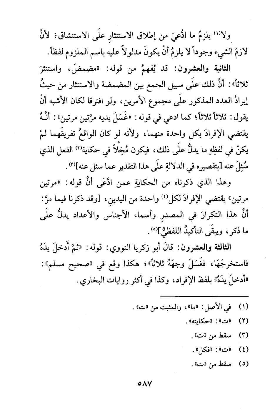 الثانية والعشرون: قد يُفهمُ من قوله: "مضمضَ، واستنثرَ ثلاثاً": أنَّ ذلك علَى سبيل الجمع بين المضمضة والاستنثار من حيثُ إيرادُ العدد المذكور علَى مجموع الأمرين، ولو افترقا لكان الأشبه أنْ يقول: ثلاثاً ثلاثاً؛ كما ادعي في قوله: "غَسَلَ يديه مرَّتين مرتين": أنَّهُ يقتضي الإفرادَ بكل واحدة منهما، ولأنه لو كان الواقعُ تفريقَهما لمْ يكنْ في لفظِهِ ما يدلُّ علَى ذلك، فيكون مُخِلًّا في حكاية (¬2) الفعل الذي سُئِلَ عنه [بتقصيره في الدلالةِ علَى هذا التقدير عما سئل عنه] (¬3).