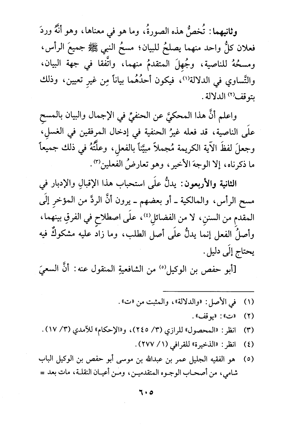 واعلم أنَّ هذا المحكيَّ عن الحنفيِّ في الإجمال والبيان بالمسحِ علَى الناصية، قد فعله غيرُ الحنفية في إدخال المرفقين في الغسلِ، وجعلَ لفظَ الآية الكريمة مُجملاً مبيَّناً بالفعلِ، وعلَّتُهُ في ذلك جميعاً ما ذكرناه، إلا الوجهَ الأخير، وهو تعارضُ الفعلين (¬3).