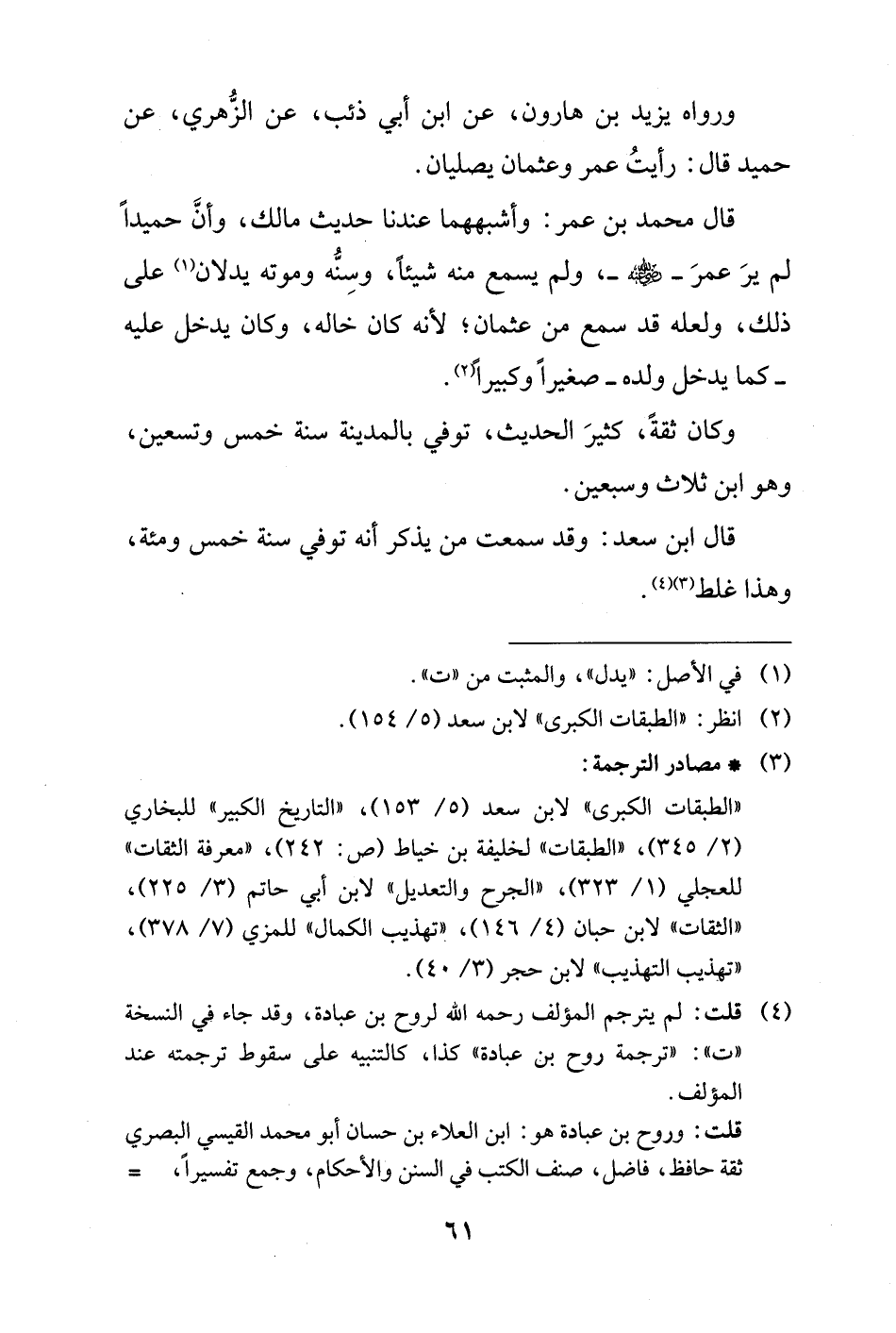 قال محمد بن عمر: وأشبههما عندنا حديث مالك، وأنَّ حميداً لم يرَ عمرَ - رضي الله عنه -، ولم يسمع منه شيئاً، وسِنُّه وموته يدلان (¬1) على ذلك، ولعله قد سمع من عثمان؛ لأنه كان خاله، وكان يدخل عليه - كما يدخل ولده - صغيراً وكبيراً (¬2).