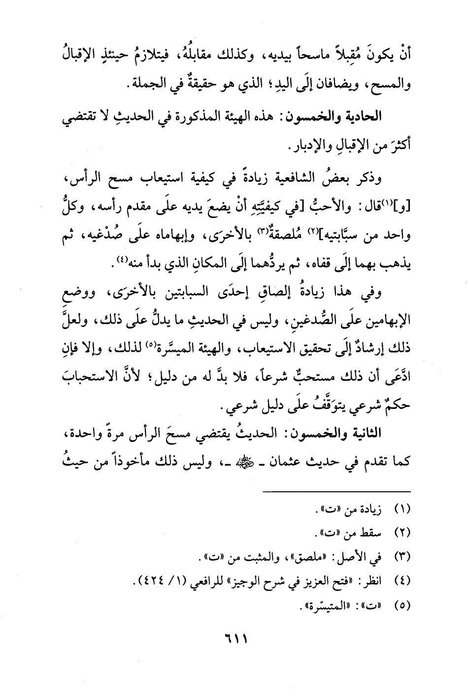 وفي هذا زيادةُ إلصاقِ إحدَى السبابتين بالأخرَى، ووضعِ الإبهامين علَى الصُّدغينِ، وليس في الحديثِ ما يدلُّ علَى ذلك، ولعلَّ ذلك إرشادٌ إلَى تحقيق الاستيعاب، والهيئة الميسَّرة (¬5) لذلك، وإلا فإنِ ادَّعَى أن ذلك مستحبٌّ شرعًا، فلا بدَّ له من دليل؛ لأنَّ الاستحبابَ حكمٌ شرعي يتوَقَّفُ علَى دليل شرعي.