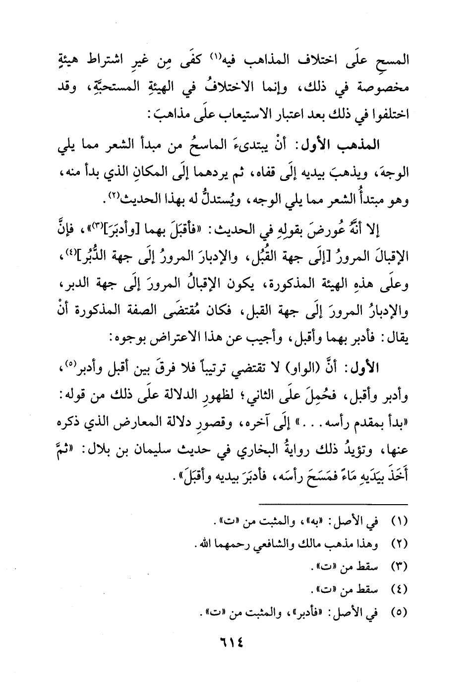 الأول: أنَّ (الواو) لا تقتضي ترتيبًا فلا فرقَ بين أقبل وأدبر (¬5)، وأدبر وأقبل، فحُمِلَ علَى الثاني؛ لظهورِ الدلالة علَى ذلك من قوله: "بدأ بمقدم رأسه ... " إلَى آخره، وقصورِ دلالة المعارض الذي ذكره عنها، وتؤيدُ ذلك روايةُ البخاري في حديث سليمان بن بلال: "ثمَّ أَخَذَ بيَدَيهِ مَاءً فمَسَحَ رأسَه، فأدبَرَ بيديه وأقبَلَ".