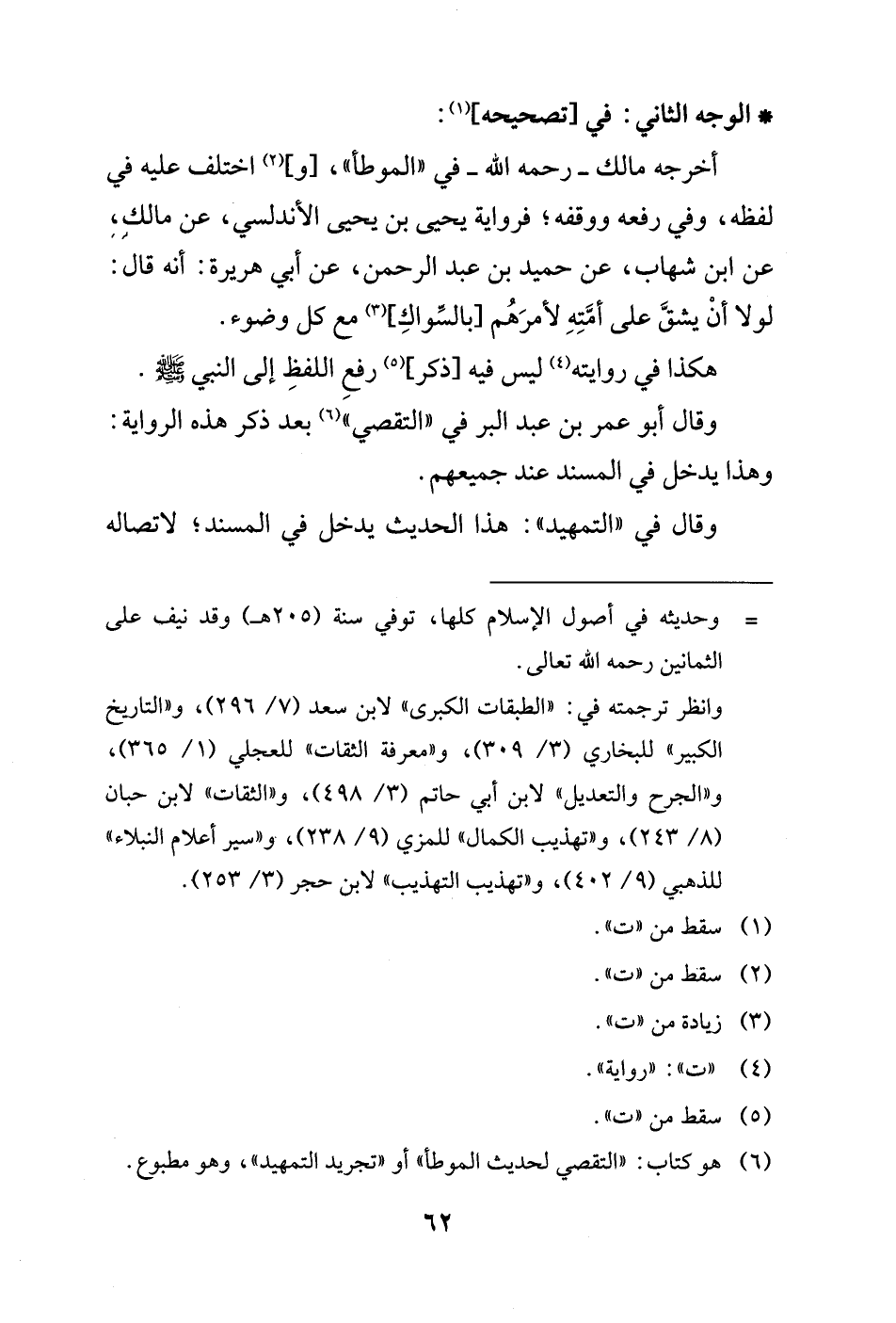 أخرجه مالك - رحمه الله - في "الموطأ"، [و] (¬2) اختلف عليه في لفظه، وفي رفعه ووقفه؛ فرواية يحيى بن يحيى الأندلسي، عن مالك؛ عن ابن شهاب، عن حميد بن عبد الرحمن، عن أبي هريرة: أنه قال: لولا أنْ يشقَّ على أمَّتِهِ لأمرَهُم [بالسِّواكِ] (¬3) مع كل وضوء.
