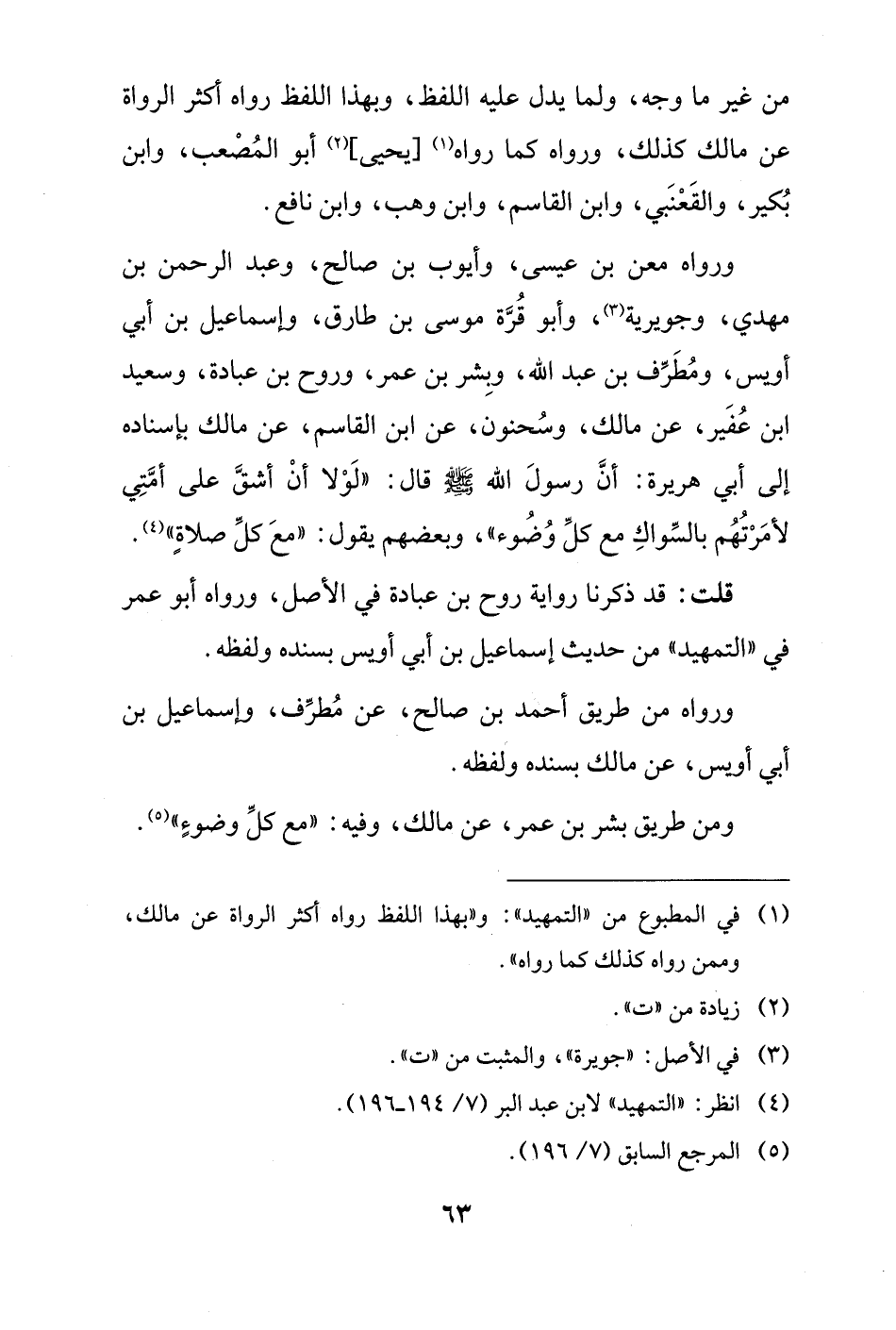 ورواه معن بن عيسى، وأيوب بن صالح، وعبد الرحمن بن مهدي، وجويرية (¬3)، وأبو قُرَّة موسى بن طارق، وإسماعيل بن أبي أويس، ومُطَرِّف بن عبد الله، وبِشر بن عمر، وروح بن عبادة، وسعيد ابن عُفَير، عن مالك، وسُحنون، عن ابن القاسم، عن مالك بإسناده إلى أبي هريرة: أنَّ رسولَ الله - صلى الله عليه وسلم - قال: "لَوْلا أنْ أشقَّ على أمَّتِي لأمَرْتُهُم بالسِّواكِ مع كلِّ وُضُوء"، وبعضهم يقول: "معَ كلِّ صلاةٍ" (¬4).