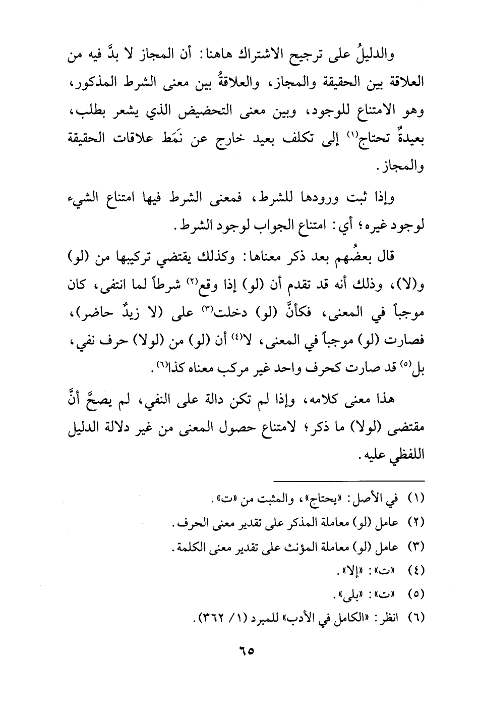 هذا معنى كلامه، وإذا لم تكن دالة على النفي، لم يصحَّ أنَّ مقتضى (لولا) ما ذكر؛ لامتناع حصول المعنى من غير دلالة الدليل اللفظي عليه.