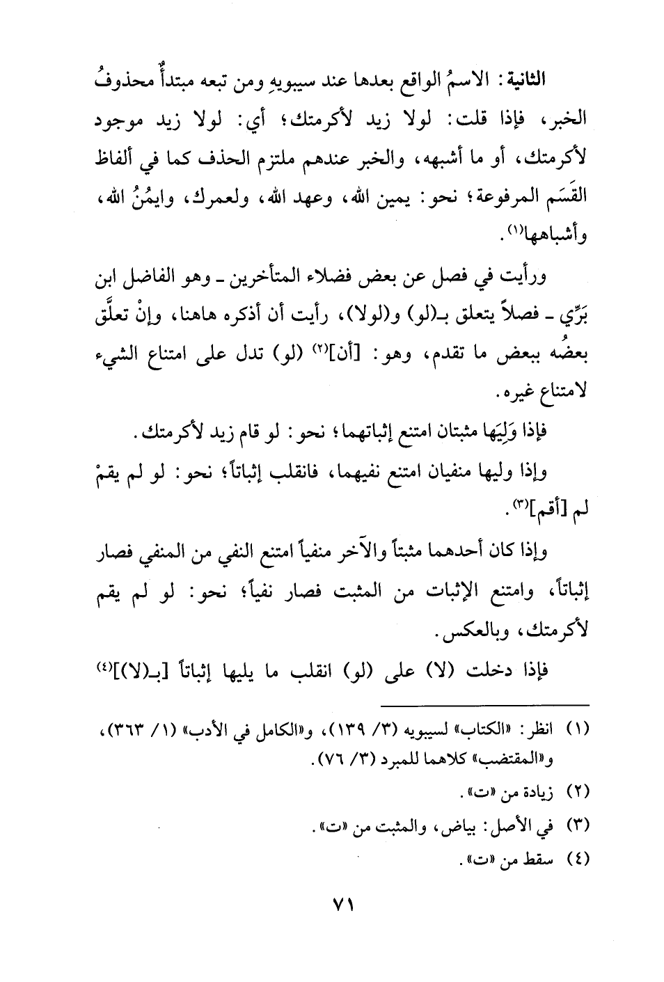 الثانية: الاسمُ الواقع بعدها عند سيبويهِ ومن تبعه مبتدأٌ محذوفُ الخبر، فإذا قلت: لولا زيد لأكرمتك؛ أي: لولا زيد موجود لأكرمتك، أو ما أشبهه، والخبر عندهم ملتزم الحذف كما في ألفاظ القَسَم المرفوعة؛ نحو: يمين الله، وعهد الله، ولعمرك، وايمُنُ الله، وأشباهها (¬1).