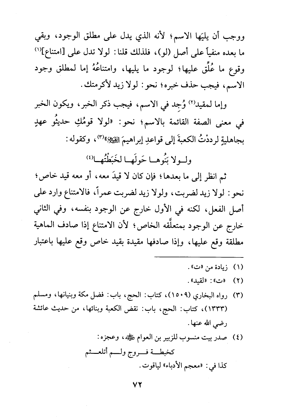 وإما لمقيد (¬2) وُجِد في الاسم، فيجب ذكر الخبر، ويكون الخبر في معنى الصفة القائمة بالاسم؛ نحو: "لولا قومُكِ حديثُو عهدٍ بجاهليةٍ لرددْتُ الكعبةَ إلى قواعدِ إبراهيمَ - عليه السلام - " (¬3)، وكقوله: