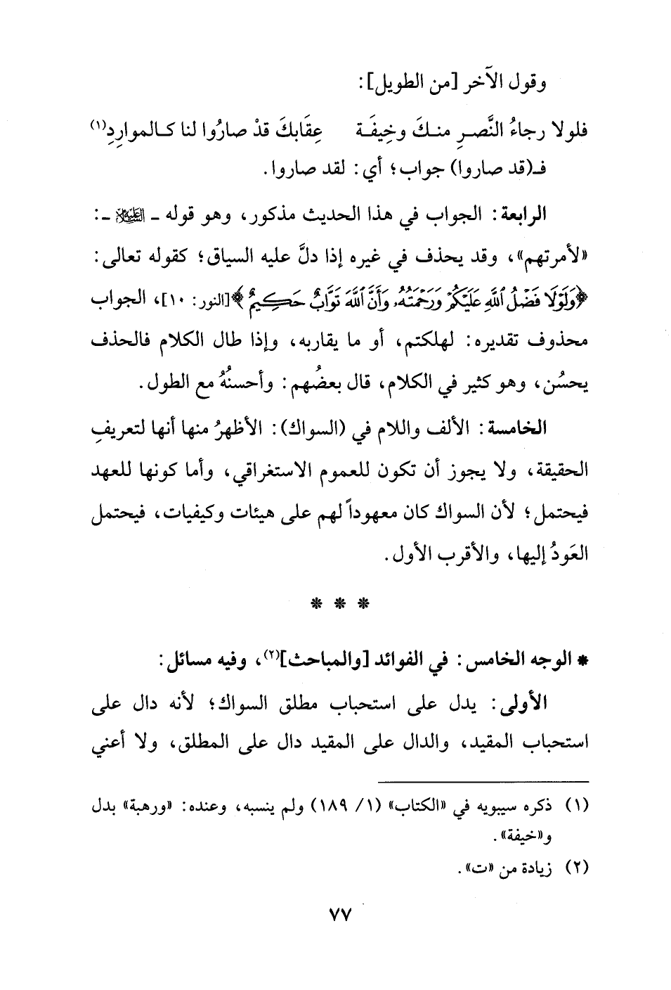 الخامسة: الألف واللام في (السواك): الأظهرُ منها أنها لتعريفِ الحقيقة، ولا يجوز أن تكون للعموم الاستغراقي، وأما كونها للعهد فيحتمل؛ لأن السواك كان معهوداً لهم على هيئات وكيفيات، فيحتمل العَودُ إليها، والأقرب الأول.