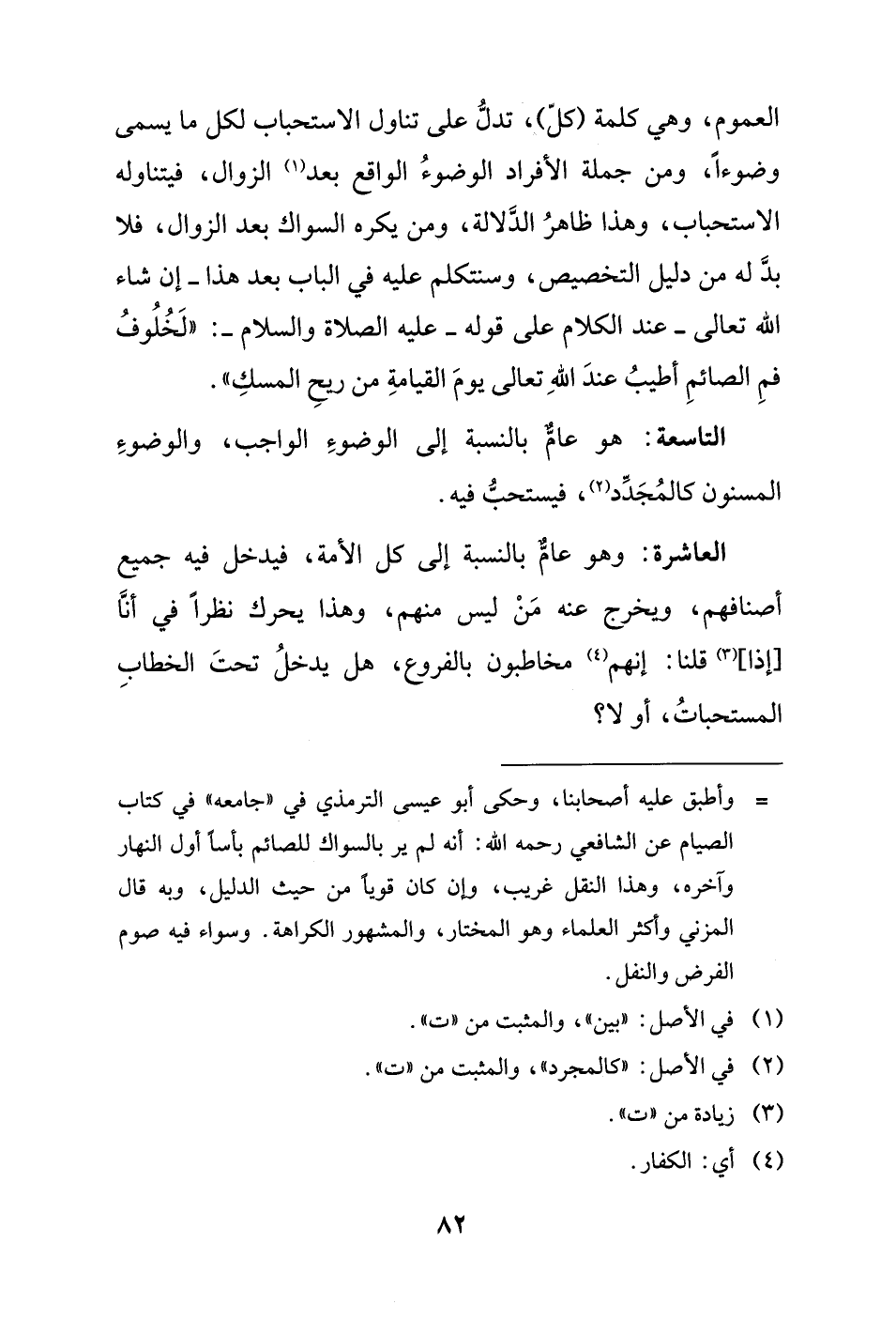 العاشرة: وهو عامٌّ بالنسبة إلى كل الأمة، فيدخل فيه جميع أصنافهم، ويخرج عنه مَنْ ليس منهم، وهذا يحرك نظراً في أنَّا [إذا] (¬3) قلنا: إنهم (¬4) مخاطبون بالفروع، هل يدخلُ تحتَ الخطابِ المستحباتُ، أو لا؟
