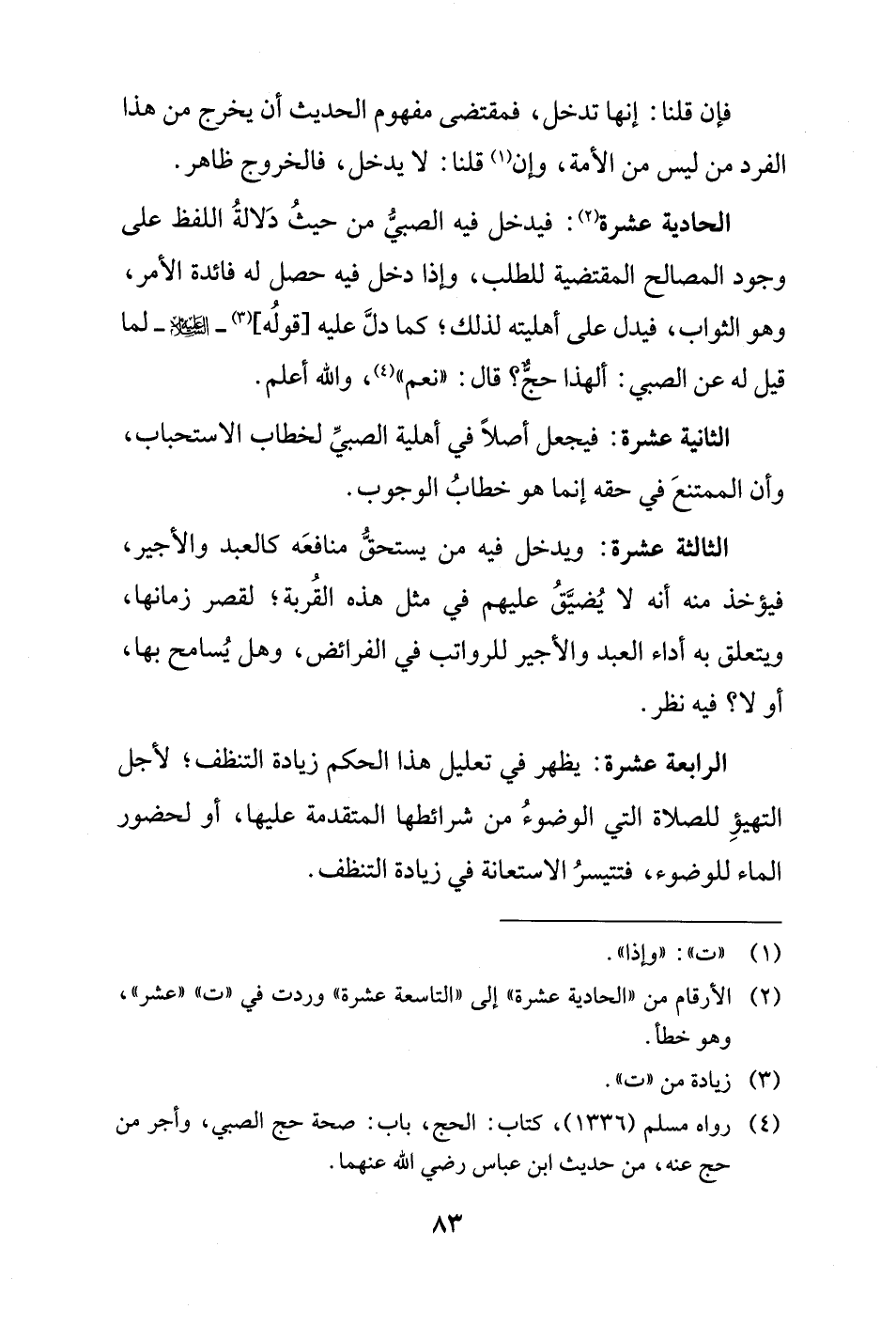 الحادية عشرة (¬2): فيدخل فيه الصبيُّ من حيثُ دَلالةُ اللفظ على وجود المصالح المقتضية للطلب، وإذا دخل فيه حصل له فائدة الأمر، وهو الثواب، فيدل على أهليته لذلك؛ كما دلَّ عليه [قولُه] (¬3) - عز وجل - لما قيل له عن الصبي: ألهذا حجٌّ؟ قال: "نعم" (¬4)، والله أعلم.