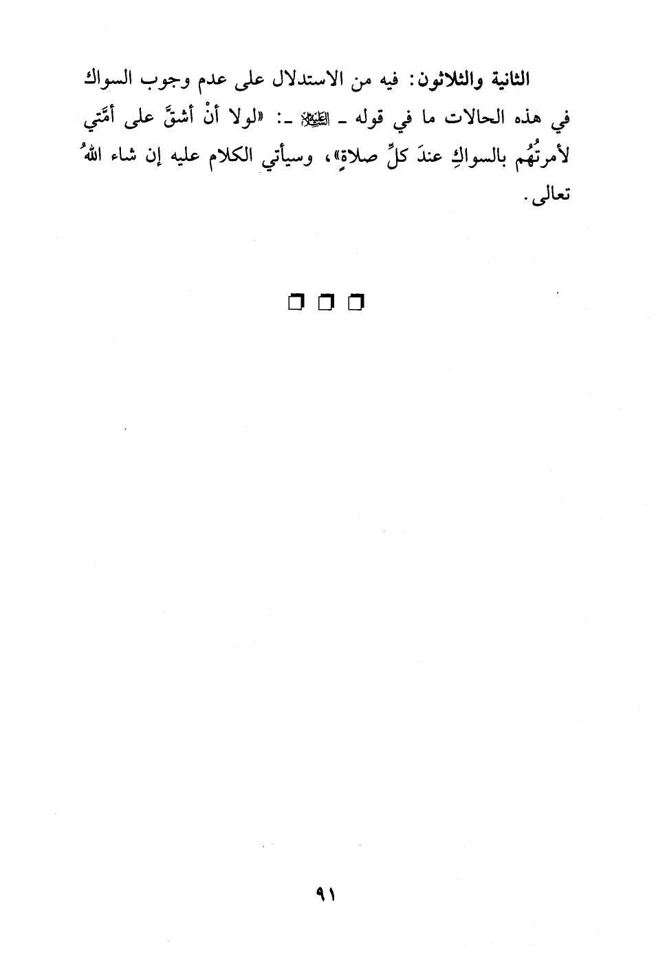 الثانية والثلاثون: فيه من الاستدلال على عدم وجوب السواك في هذه الحالات ما في قوله - عليه السلام -: "لولا أنْ أشقَّ على أمَّتي لأمرتُهُم بالسواكِ عندَ كلِّ صلاةٍ"، وسيأتي الكلام عليه إن شاء اللهُ تعالى.