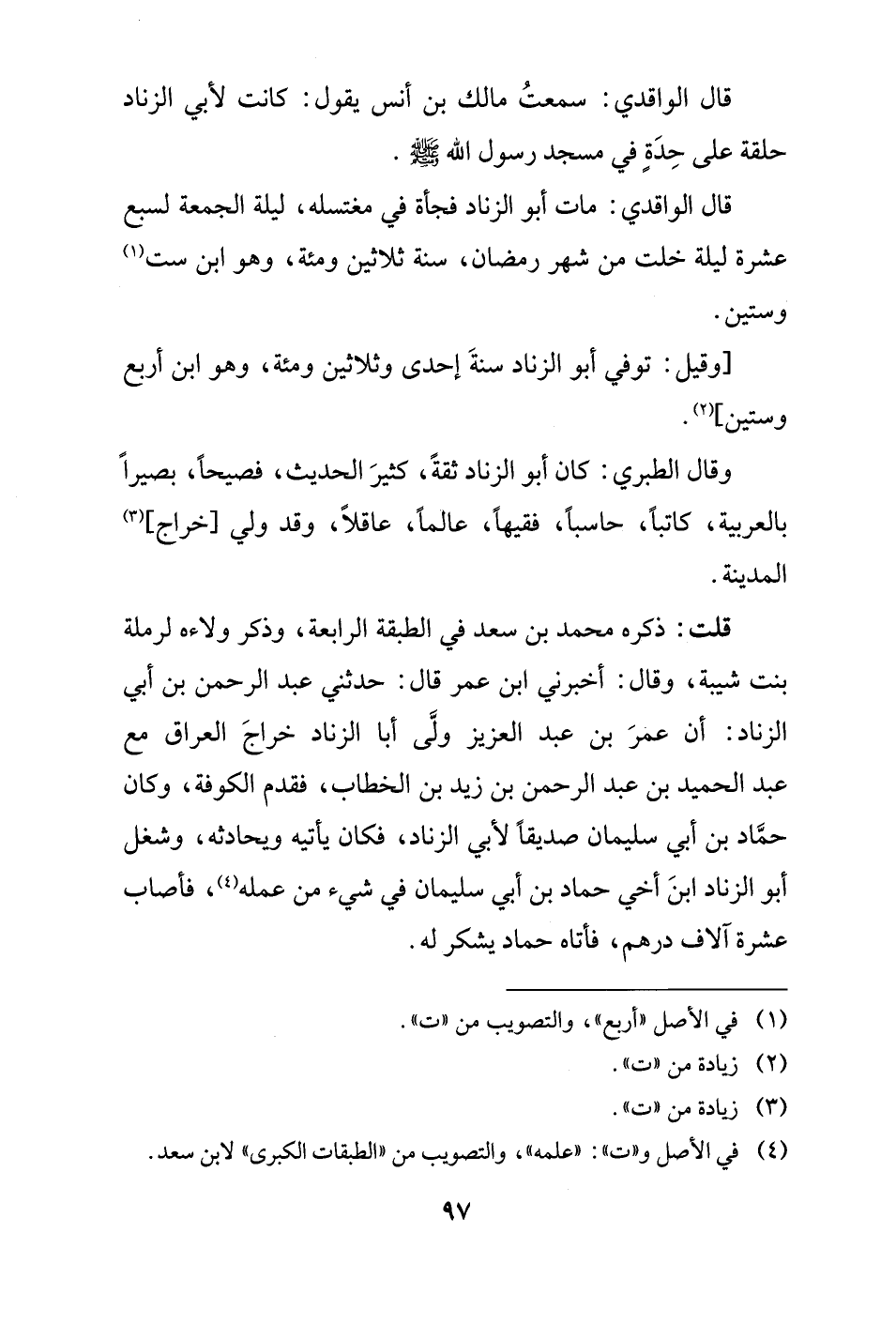 قلت: ذكره محمد بن سعد في الطبقة الرابعة، وذكر ولاءه لرملة بنت شيبة، وقال: أخبرني ابن عمر قال: حدثني عبد الرحمن بن أبي الزناد: أن عمرَ بن عبد العزيز ولَّى أبا الزناد خراجَ العراق مع عبد الحميد بن عبد الرحمن بن زيد بن الخطاب، فقدم الكوفة، وكان حمَّاد بن أبي سليمان صديقاً لأبي الزناد، فكان يأتيه ويحادثه، وشغل أبو الزناد ابنَ أخي حماد بن أبي سليمان في شيء من عمله (¬4)، فأصاب عشرة آلاف درهم، فأتاه حماد يشكر له.
