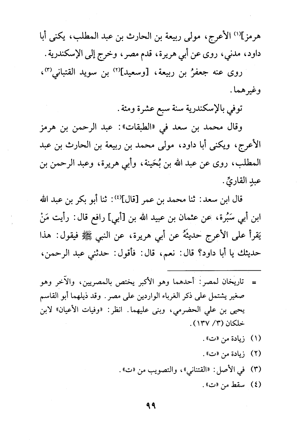 وقال محمد بن سعد في "الطبقات": عبد الرحمن بن هرمز الأعرج، ويكنى أبا داود، مولى محمد بن ربيعة بن الحارث بن عبد المطلب، روى عن عبد الله بن بُحَينة، وأبي هريرة، وعبد الرحمن بن عبدٍ القاريِّ.