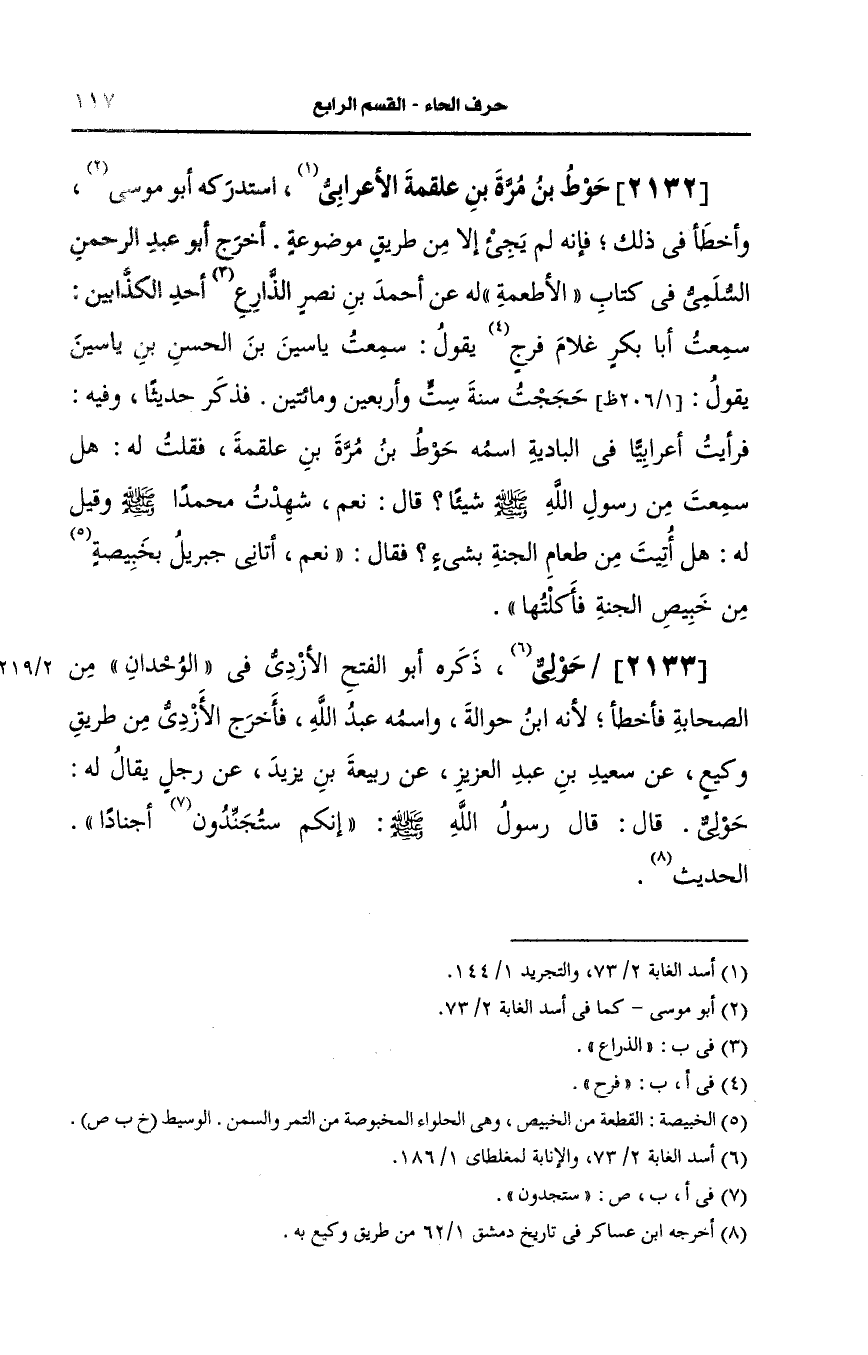 استدرَكَه أَبو موسى وأخطأ وفي ذلك فإنه لم يجيء إلا من طريق موضوعة أخرج أَبو عبد الرحمن السلمي في كتاب الأطعمة له، عَن أَحمد بن نصر الذارع أحد الكذابين سمعت أبا بكر غلام فرج يقول سمعت ياسين بن الحسن بن ياسين يقول حججت سنة ست وأربعين ومائتين فذكر حديثا وفيه فرأيت أعرابيا في البادية اسمه حوط بن مرة بن علقمة فقلت له هل سمعت من رسول الله صَلى الله عَلَيه وسَلم شيئا قال نعم شهدت محمدا صَلى الله عَلَيه وسَلم وقيل له هل أتيت من طعام الجنة بشيء فقال نعم أتاني جبريل بخبيصة من خبيص الجنة فأكلتها.