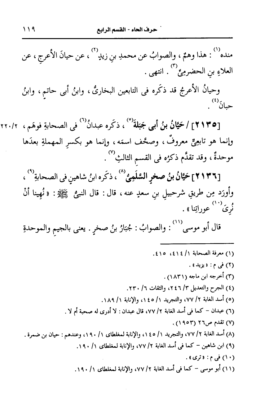 قال أَبو موسى والصواب جبار بن صخر يعني بالجيم والموحدة وآخره راء وهو كَما قَال ومن قال حيان فقد صحفه ووقع عند عبدان في هذا الحديث بعينه حيان بن ضمرة فصحف أباه أيضًا.