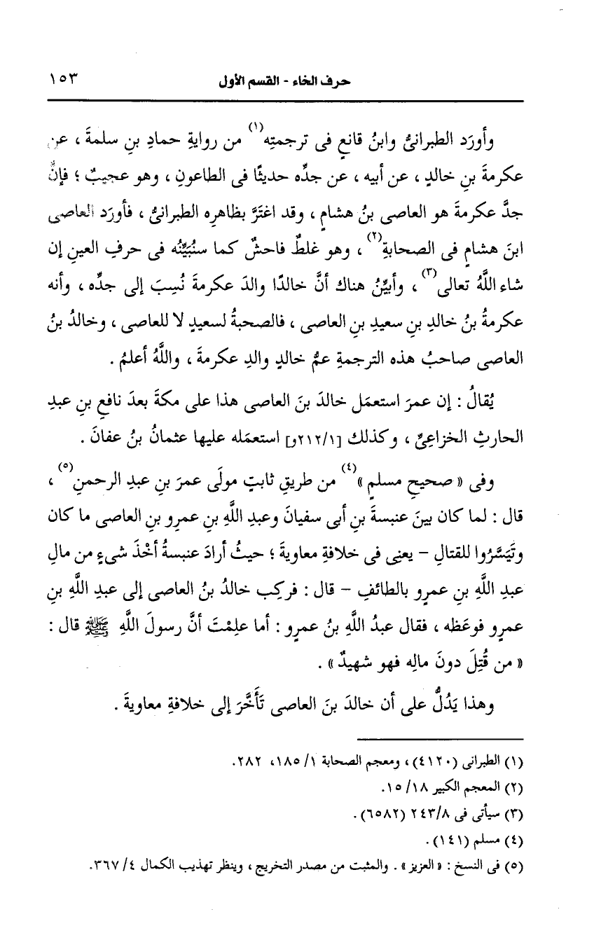 وفي صحيح مسلم من طريق ثابت مولى عمر بن عبد العزيز قال لما كان بين عنبسة بن أبي سفيان وعبد الله بن عَمرو بن العاص ما كان وتيسروا للقتال يعني في خلافة معاوية حيث أراد عنبسة أخذ شيء من مال عَبد الله بن عَمرو بالطائف قال فركب خالد بن العاص إلى عَبد الله بن عَمرو فوعظه فقال عَبد الله بن عَمرو أما علمت أن رسول الله صَلى الله عَلَيه وسَلم قال من قتل دون ماله فهو شهيد.