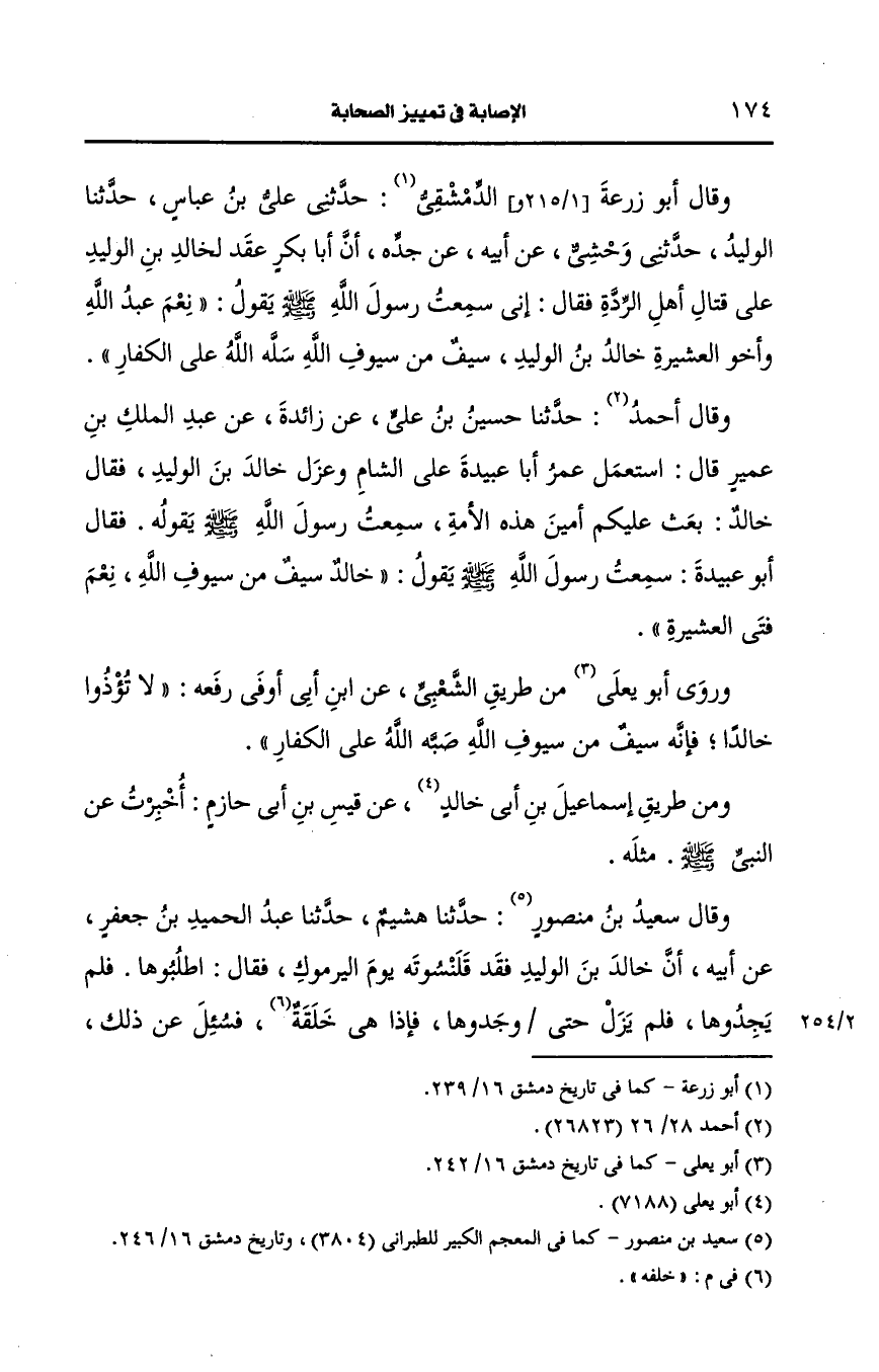 وروى أَبو يعلى من طريق الشعبي، عَن ابن أبي أوفى رفعه لا تؤذوا خالدا فإنه سيف من سيوف الله صبه الله على الكفار.