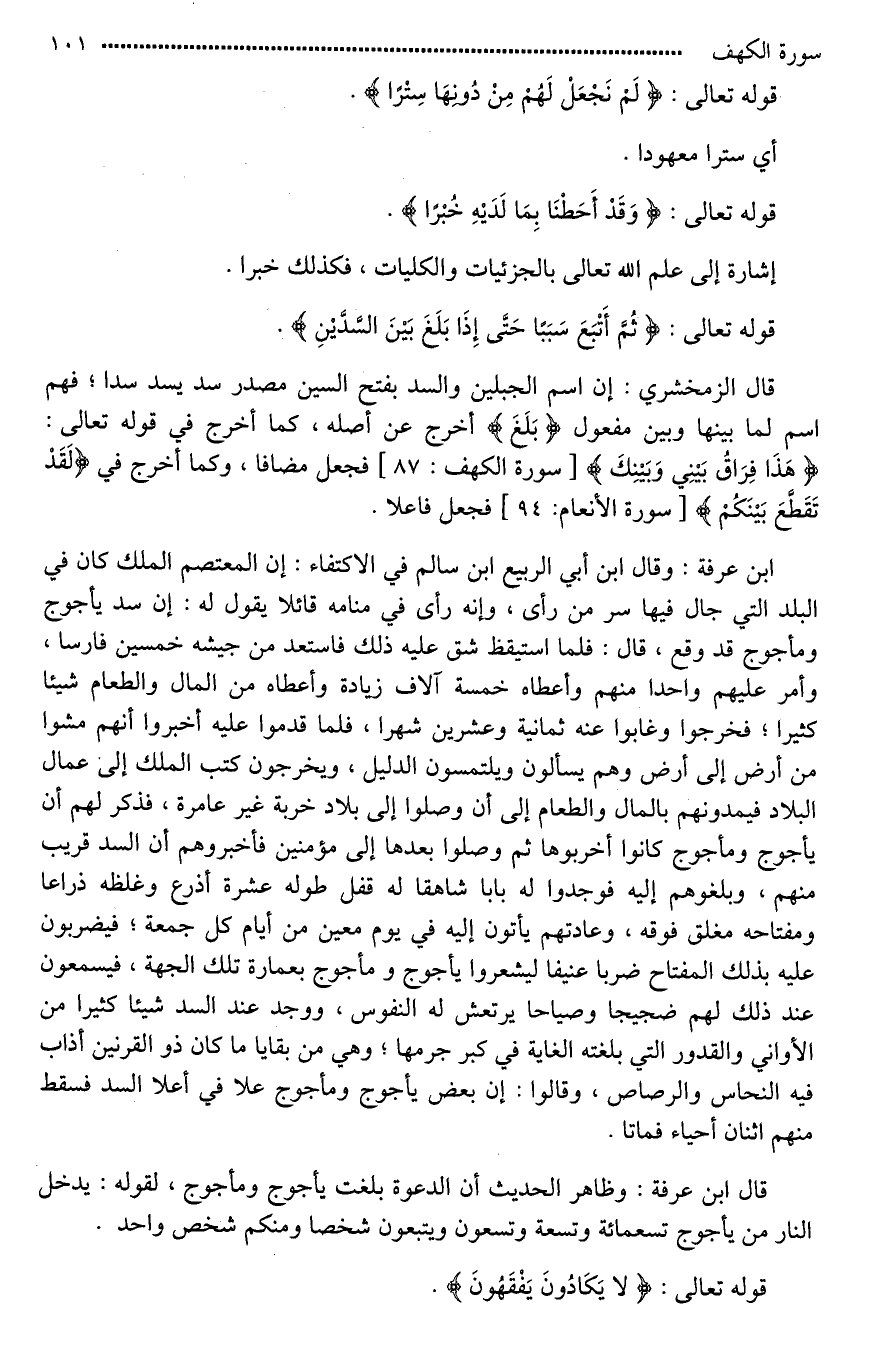 ابن عرفة: وقال ابن أبي الربيع ابن سالم في الاكتفاء: إن المعتصم الملك كان في البلد التي جال فيها سر من رأى، وإنه رأى في منامه قائلا يقول له: إن سد يأجوج ومأجوج قد وقع، قال: فلما استيقظ شق عليه ذلك فأعد من جيشه خمسين فارسا، وأمَّر عليهم واحدا منهم، وأعطاه خمسة آلاف زيادة، وأعطاه من المال والطعام شيئا كثيرا؛ فخرجوا وغابوا عنه ثمانية وعشرين شهرا، فلما قدموا عليه أخبروا أنهم مشوا من أرض إلى أرض وهم يسألون ويلتمسون الدليل، ويخرجون كتب الملك إلى عمال البلاد فيمدونهم بالمال والطعام إلى أن وصلوا إلى بلاد خربة غير عامرة، فذكر لهم أن يأجوج ومأجوج كانوا أخربوها ثم وصلوا بعدها إلى مؤمنين فأخبروهم أن السد قريب منهم، وبلغوهم إليه فوجدوا له بابا شاهقا له قفل طوله عشرة أذرع وغلظه ذراعا ومفتاحه مغلق فوقه، وعادتهم يأتون إليه في يوم معين من أيام كل جمعة؛ فيضربون عليه بذلك المفتاح ضربا عنيفا ليشعروا يأجوج ومأجوج بعمارة تلك الجهة، فيسمعون عند ذلك لهم ضجيجا وصياحا يرتعش له النفوس، ووجد عند السد شيئا كثيرا من الأواني والقدور التي بلغته الغاية في كبر جرمها، وهي من بقايا ما كان ذو القرنين أذاب فيه النحاس والرصاص، وقالوا: إن بعض يأجوج ومأجوج علا في أعلى السد فسقط منهم اثنان أحياء فماتا.
