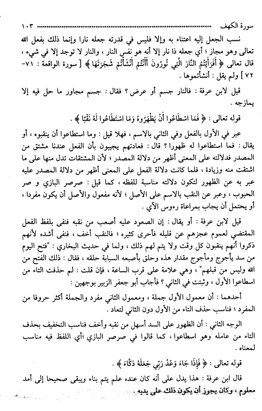 قيل لابن عرفة: أو يقال: إن الصعود عليه أصعب من نقبه فنفى بلفظ الفعل المقتضي لعموم عجزهم عن قليله فأحرى كثيره؛ فالنقب أخف، فنفى أشده لأنهم ذكروا أنهم ينقبون كل وقت ولا يتم لهم ذلك، ولما في حديث البخاري: " [فُتِحَ اليَوْمَ مِنْ رَدْمِ يَأْجُوجَ وَمَأْجُوجَ مِثْلُ هَذِهِ» وَحَلَّقَ بِإِصْبَعِهِ الإِبْهَامِ وَالَّتِي تَلِيهَا*] "، وهي علامة على قرب الساعة، فإن قلت: لم حذفت التاء من اسطاعوا الأول، وثبتت في الثاني؟ فأجاب أبو جعفر الزبير بوجهين: