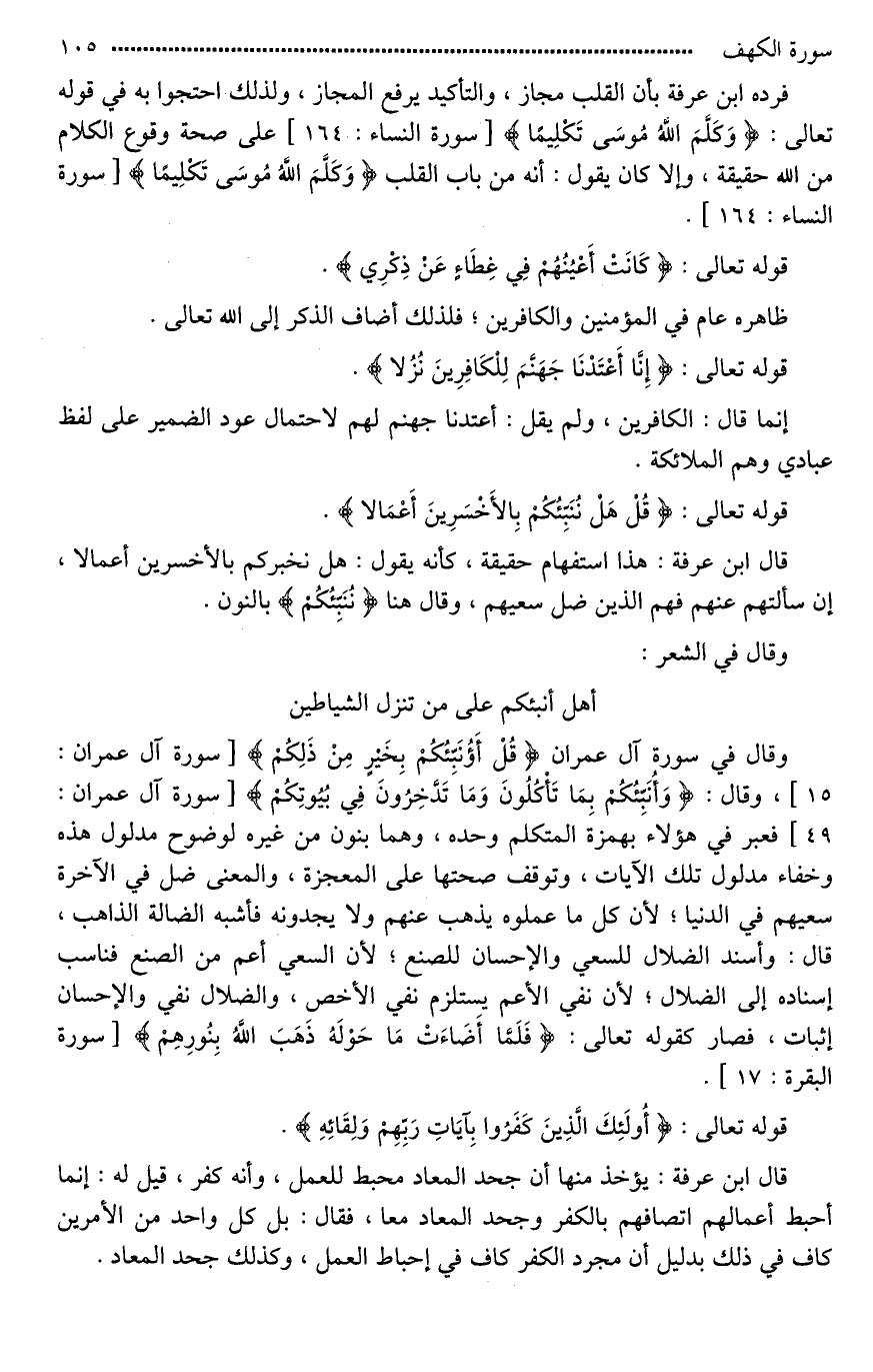 وقال في سورة آل عمران (قُلْ أَؤُنَبِّئُكُمْ بِخَيْرٍ مِنْ ذَلِكُمْ)، وقال: (وَأُنَبِّئُكُمْ بِمَا تَأْكُلُونَ وَمَا تَدَّخِرُونَ فِي بُيُوتِكُمْ) فعبر في هؤلاء بهمزة المتكلم وحده، وهما بنون من غيره لوضوح مدلول هذه وخفاء مدلول تلك الآيات، وتوقف صحتها على المعجزة، والمعنى ضل في الآخرة سعيهم في الدنيا؛ لأن كل ما عملوه يذهب عنهم ولا يجدونه فأشبه الضالة الذاهب، قال: وأسند الضلال للسعي والإحسان للصنع؛ لأن السعي أعم من الصنع، فناسب إسناده إلى الضلال؛ لأن نفي الأعم يستلزم نفي الأخص، والضلال نفي والإحسان إثبات، فصار كقوله تعالى: (فَلَمَّا أَضَاءَتْ مَا حَوْلَهُ ذَهَبَ اللَّهُ بِنُورِهِمْ).