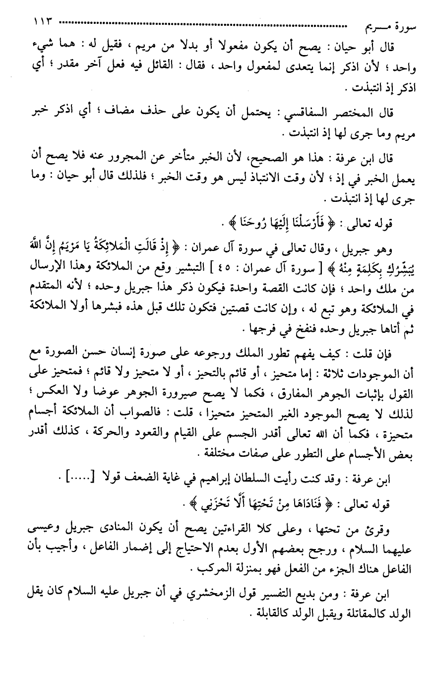 ابن عرفة: [ومن بدع التفسير قول الزمخشري في أن جبريل عليه السلام كان يُقَبِّل الولدَ كالقابلة*].