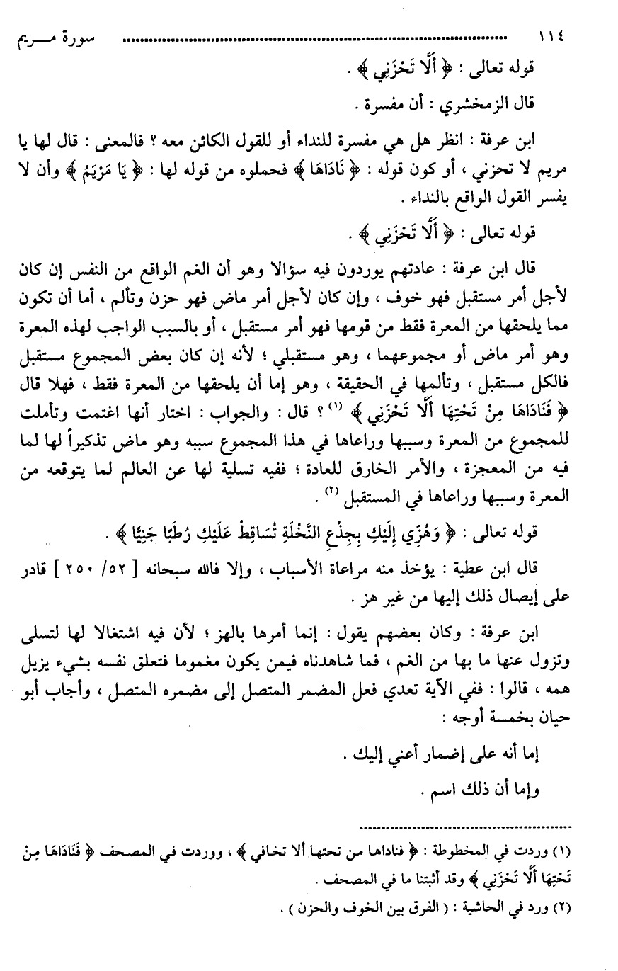ابن عرفة: انظر هل هي مفسرة للنداء أو للقول الكائن معه؟ فالمعنى: قال لها يا مريم لَا تحزني، أو كون قوله: (نَادَاهَا) فحملوه من قوله لها: (يَا مَرْيَمُ) وأن لا يفسر القول الواقع بالنداء.