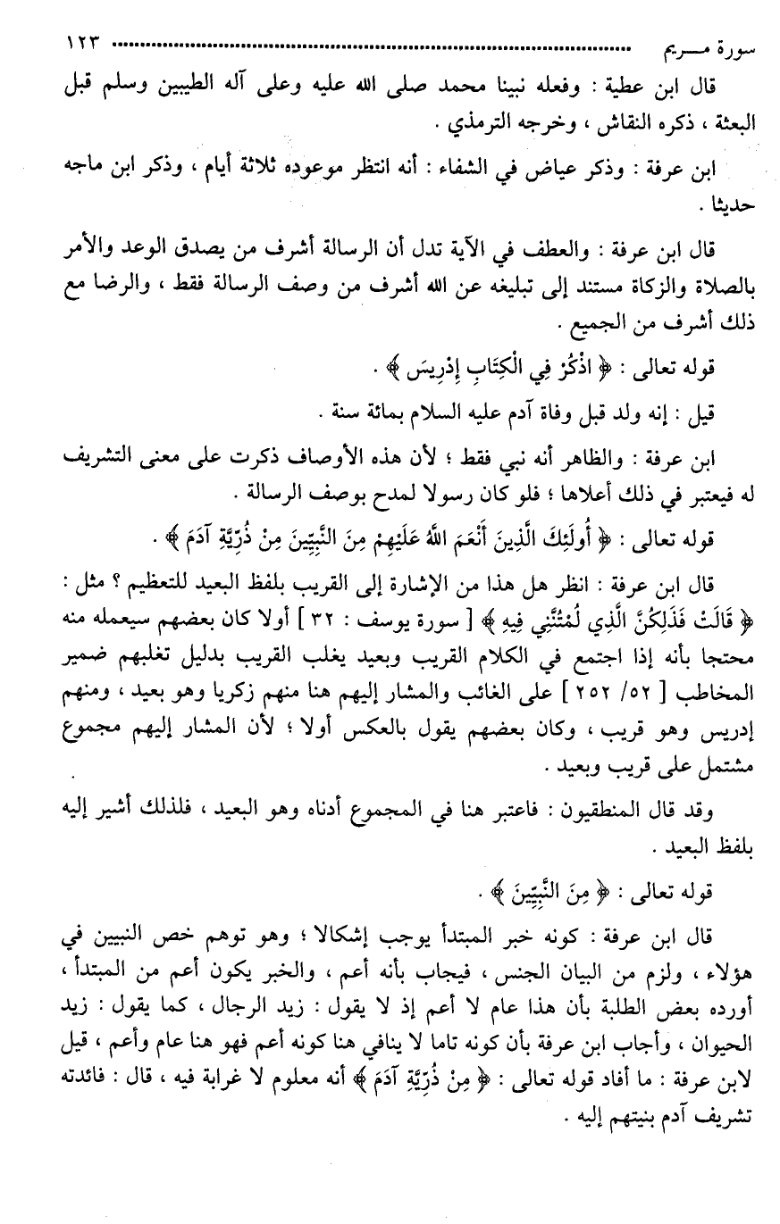قال ابن عرفة: انظر هل هذا من الإشارة إلى القريب بلفظ البعيد للتعظيم؟ مثل: (قَالَتْ فَذَلِكُنَّ الَّذِي لُمْتُنَّنِي فِيهِ) [أو لا؟ *] كان بعضهم سيعمله منه محتجا بأنه إذا اجتمع في الكلام القريب وبعيد يغلب القريب بدليل [تغليبهم*] ضمير المخاطب على الغائب والمشار إليهم هنا منهم زكريا وهو بعيد، ومنهم إدريس، وهو قريب، وكان بعضهم يقول بالعكس أولا؛ لأن المشار إليهم مجموع مشتمل على قريب وبعيد.