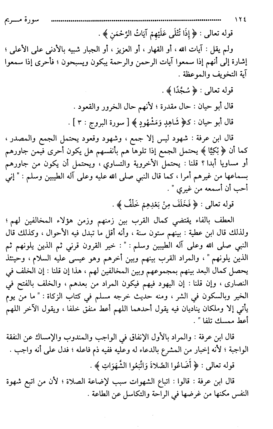 قال ابن عرفة: شهود ليس إلا جمع، وشهود وقعود يحتمل الجمع والمصدر، كما أن (بُكِيًّا) يحتمل الجمع إذا تلوها هم بأنفسهم هل يكون أحرى فيمن جاورهم أو مساويا أبدا؟ قلنا: يحتمل الأخروية والتساوي، ويحتمل أن يكون من جاورهم بسماعها من غيرهم أمرا، كما قال النبي صلى الله عليه وعلى آله الطيبين وسلم: "إني أحب أن أسمعه من غيري".