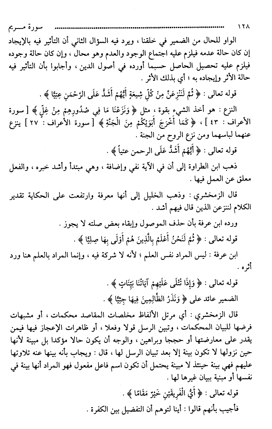 قال الزمخشري: وذهب الخليل إلى أنها معرفة وارتفعت على الحكاية تقدير الكلام لننزعن [الذين يقال فيهم أيهم أشد*].