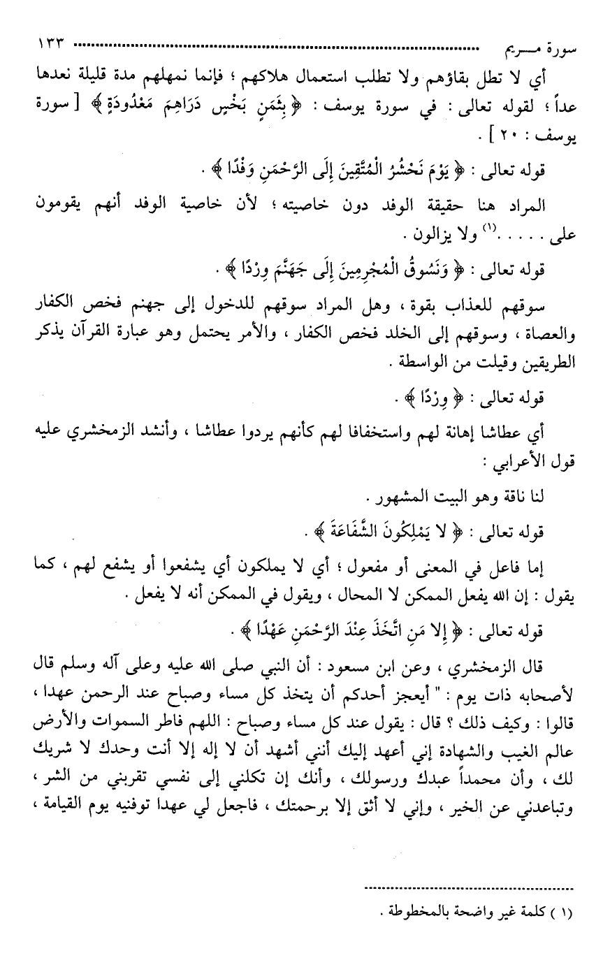 قال الزمخشري، وعن ابن مسعود: أن النبي صلى الله عليه وعلى آله وسلم قال لأصحابه ذات يوم: "أيعجز أحدكم أن يتخذ كل مساء وصباح عند الرحمن عهدا، قالوا: وكيف ذلك؟ قال: يقول عند كل مساء وصباح: اللهم فاطر السماوات والأرض عالم الغيب والشهادة إني أعهد إليك أنني أشهد أن لَا إله إلا أنت وحدك لَا شريك لك، وأن محمداً عبدك ورسولك، وأنك إن تكلني إلى نفسي تقربني من الشر، وتباعدني عن الخير، وإني لَا أثق إلا برحمتك، فاجعل لي عهدا توفنيه يوم القيامة،