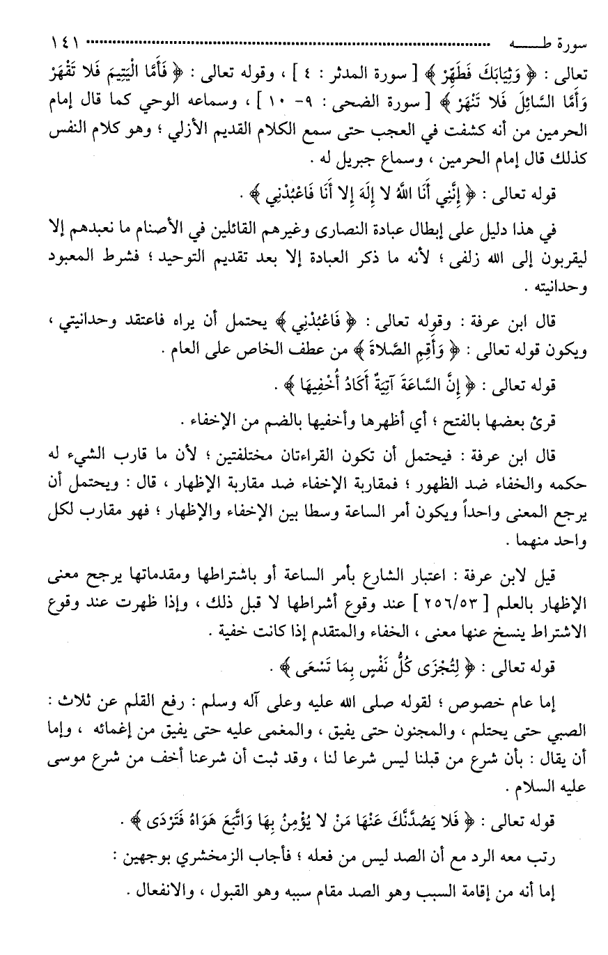 قال ابن عرفة: وقوله تعالى: (فَاعْبُدْنِي) يحتمل أن يراه فاعتقد وحدانيتي، ويكون قوله تعالى: (وَأَقِمِ الصَّلَاةَ) من عطف الخاص على العام.