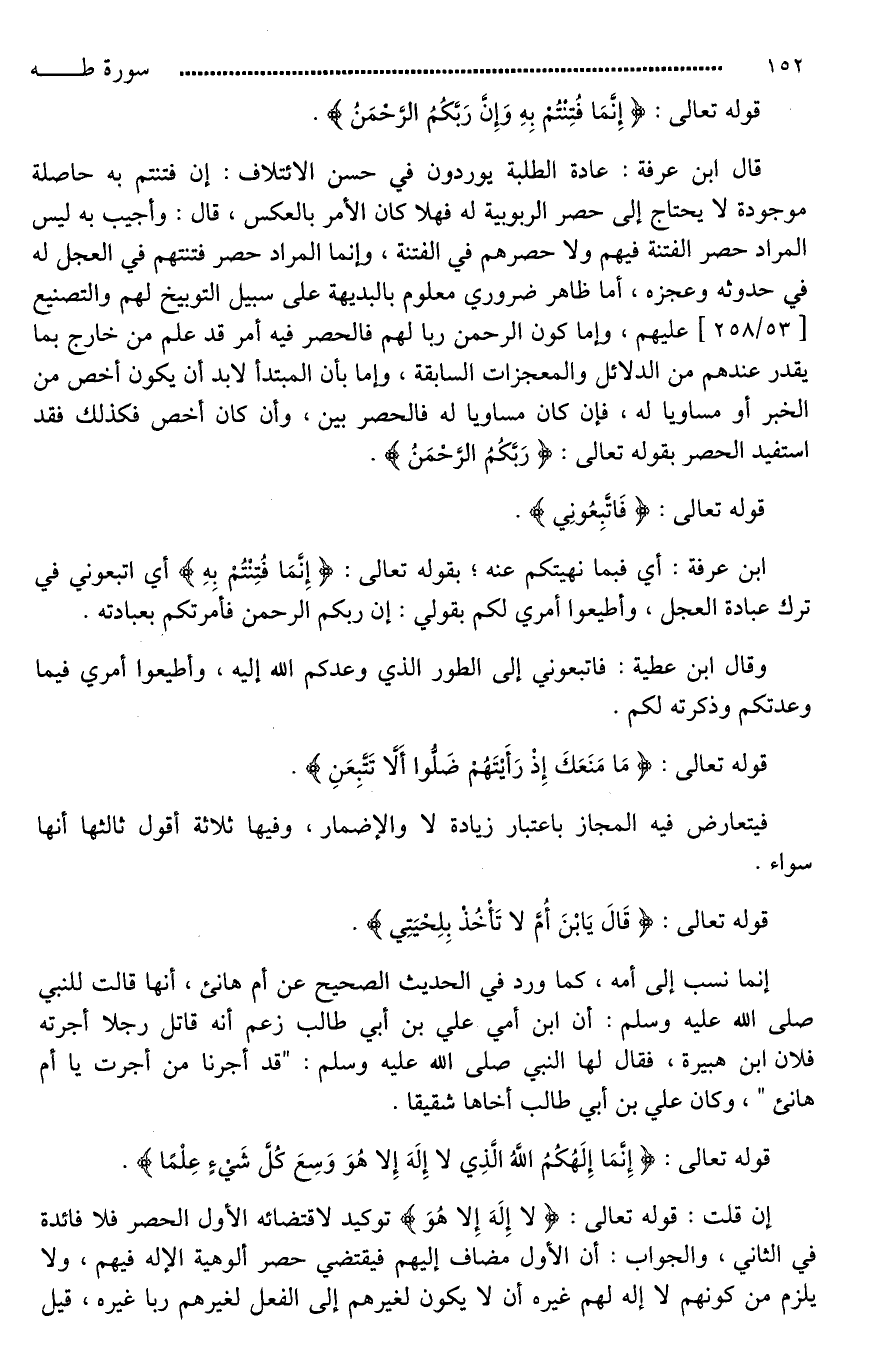 قال ابن عرفة: عادة الطلبة يوردون في حسن الائتلاف: إن فتنتم به حاصلة موجودة لَا يحتاج إلى حصر الربوبية له فهلا كان الأمر بالعكس، قال: وأجيب به ليس المراد حصر الفتنة فيهم ولا حصرهم في الفتنة، وإنَّمَا المراد حصر فتنتهم في العجل له في حدوثه وعجزه، أما ظاهر ضروري معلوم بالبديهة على سبيل التوبيخ لهم والتصنيع عليهم، وإمَّا كون الرحمن ربا لهم فالحصر فيه أمر قد علم من خارج بما يقدر عندهم من الدلائل والمعجزات السابقة، وإما بأن المبتدأ لابد أن يكون أخص من الخبر أو مساويا له، فإن كان مساويا له فالحصر بين، وأن كان أخص فكذلك فقد استفيد الحصر بقوله تعالى: (رَبَّكُمُ الرَّحْمَنُ)