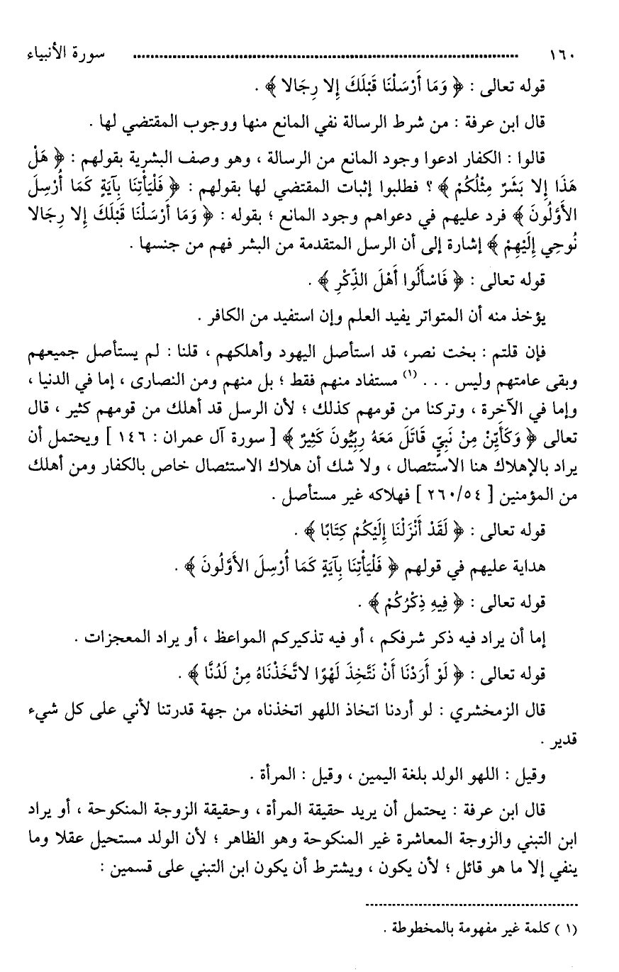 قال ابن عرفة: يحتمل أن يريد حقيقة المرأة، وحقيقة الزوجة المنكوحة، أو يراد ابن التبني والزوجة المعاشرة غير المنكوحة وهو الظاهر؛ لأن الولد مستحيل عقلا وما ينفي إلا ما هو [قابل لأن يكون*]، ويشترط أن يكون ابن التبني على قسمين: