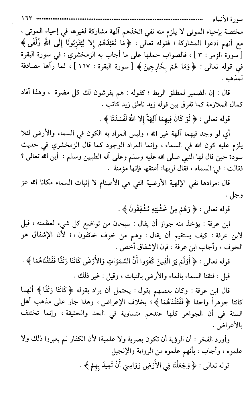 قال ابن عرفة: وكان بعضهم يقول: يحتمل أن يراد بقوله (كَانَتَا رَتْقًا) أنهما كانتا جوهرا واحدا (فَفَتَقْنَاهُمَا)؛ بخلاف الأعراض، وهذا جار على مذهب أهل السنة في أن الجواهر كلها عندهم متساوية في الحد والحقيقة، وإنما تختلف بالأعراض.