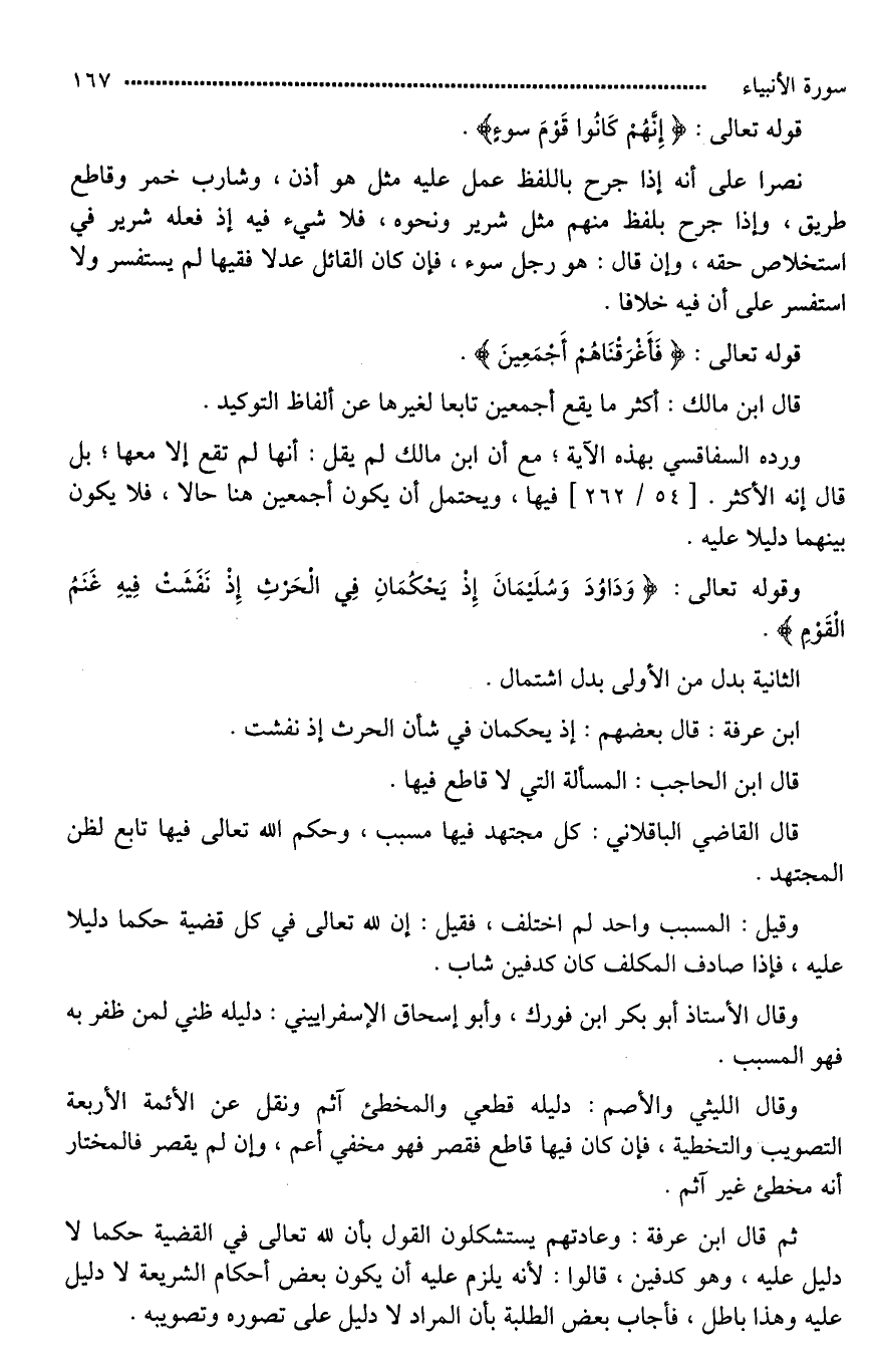 ورده السفاقسي بهذه الآية؛ مع أن ابن مالك لم يقل: أنها لم تقع إلا معها؛ بل قال إنه الأكثر فيها، ويحتمل أن يكون أجمعين هنا حالا، فلا يكون بينهما دليلا عليه.
