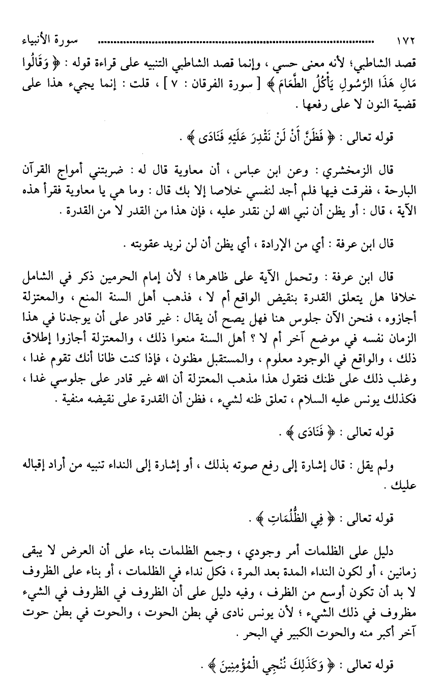 قال ابن عرفة: وتحمل الآية على ظاهرها؛ لأن إمام الحرمين ذكر في الشامل خلافا هل تتعلق القدرة بنقيض الواقع أم لَا، فذهب أهل السنة المنع، والمعتزلة أجازوه، فنحن الآن جلوس هنا فهل يصح أن يقال: غير قادر على أن يوجدنا في هذا الزمان نفسه في موضع آخر أم لَا؟ أهل السنة منعوا ذلك، والمعتزلة أجازوا إطلاق ذلك، والواقع في الوجود معلوم، والمستقبل مظنون، فإذا كنت ظانا أنك تقوم كدا، وغلب ذلك على ظنك فتقول هذا مذهب المعتزلة أن الله غير قادر على جلوسي غدا، فكذلك يونس عليه السلام، تعلق ظنه لشيء، فظن أن القدرة على نقيضه منفية.
