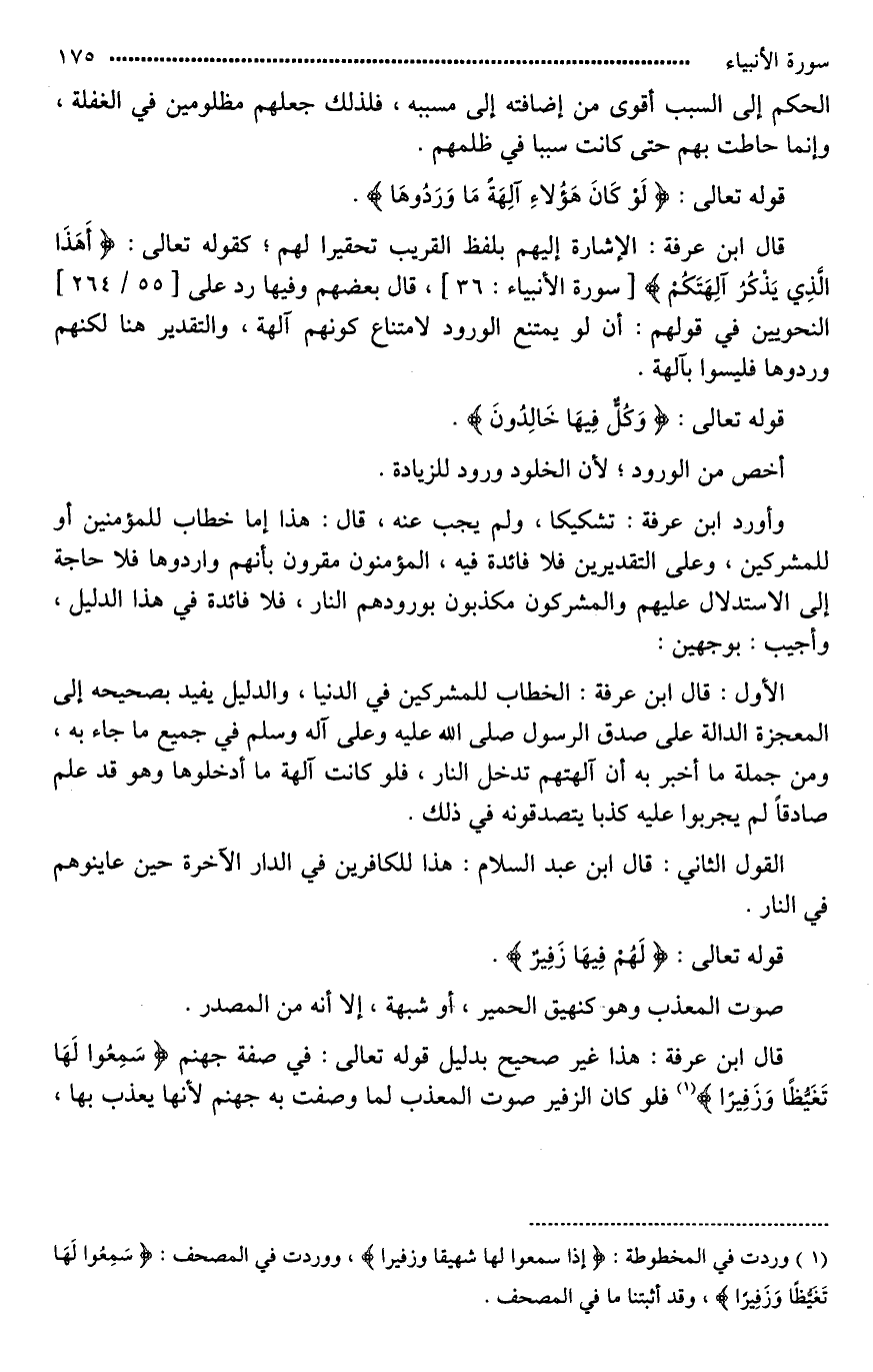 قال ابن عرفة: هذا غير صحيح بدليل قوله تعالى: في صفة جهنم (سَمِعُوا لَهَا تَغَيُّظًا وَزَفِيرًا) فلو كان الزفير صوت المعذب لما وصفت به جهنم لأنها يعذب بها،