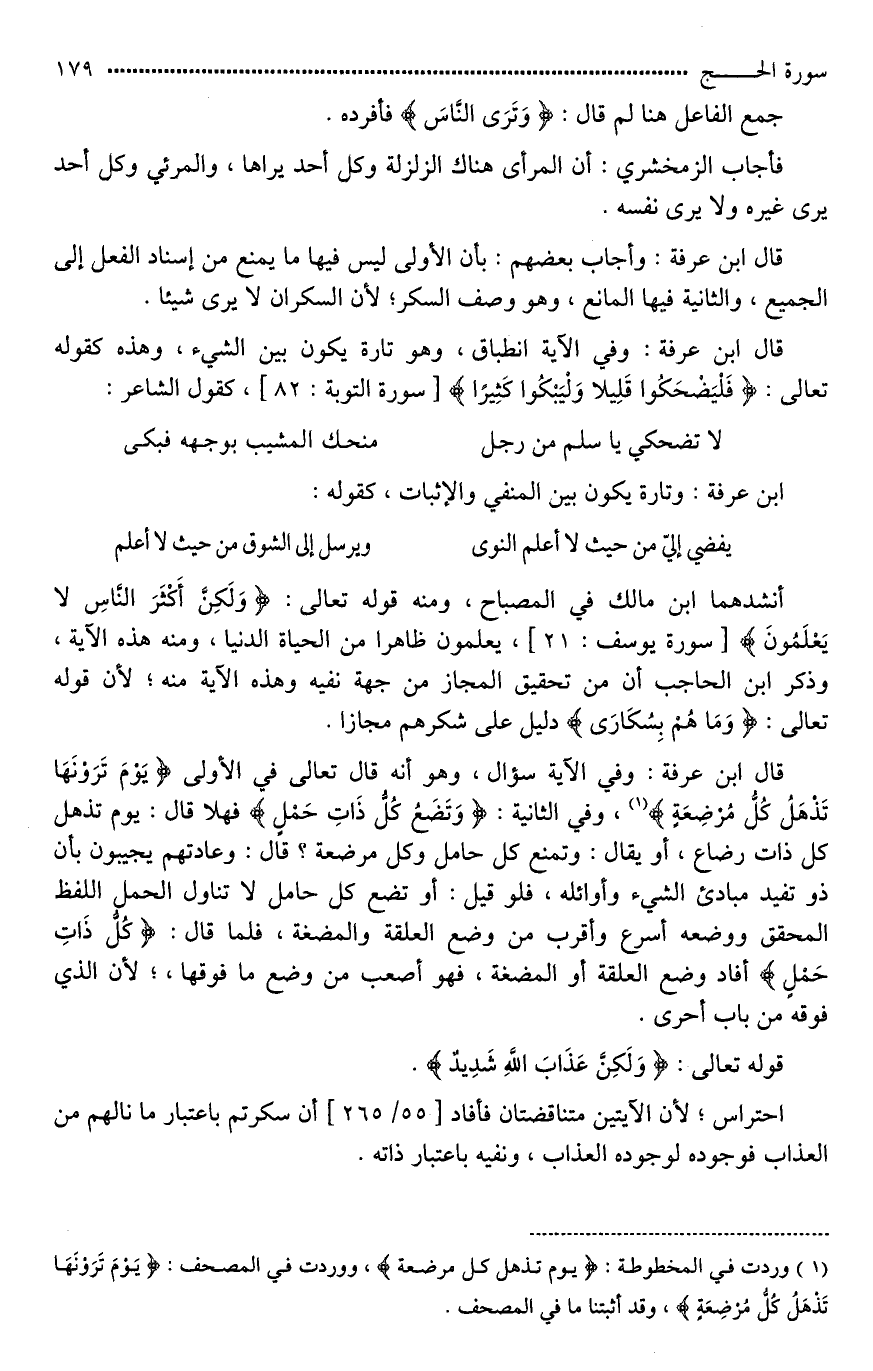 أنشدهما ابن مالك في المصباح، ومنه قوله تعالى: (وَلَكِنَّ أَكْثَرَ النَّاسِ لَا يَعْلَمُونَ (6) يَعْلَمُونَ ظَاهِرًا مِنَ الْحَيَاةِ الدُّنْيَا)، ومنه هذه الآية، وذكر ابن الحاجب أن من تحقيق المجاز من جهة نفيه وهذه الآية منه؛ لأن قوله تعالى: (وَمَا هُمْ بِسُكَارَى) دليل على [سكرهم*] مجازا.