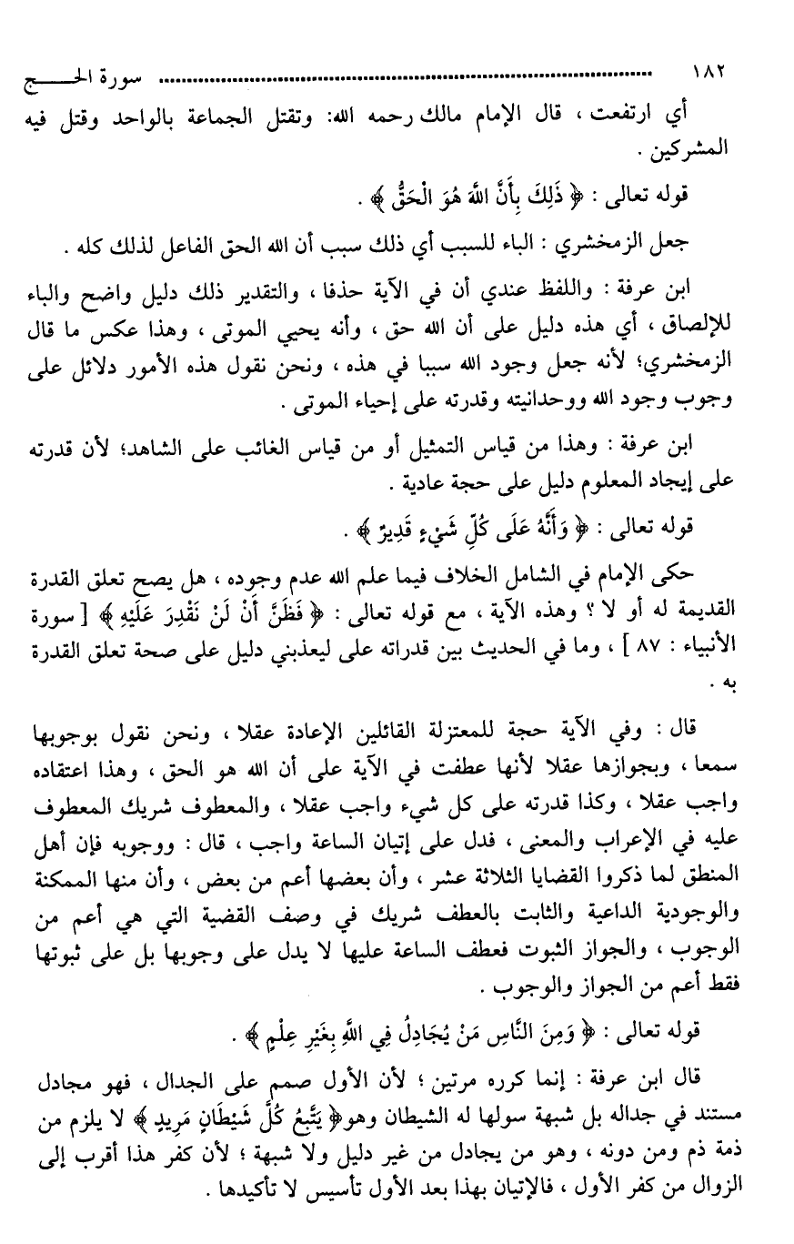 قال: وفي الآية حجة للمعتزلة القائلين بالإعادة عقلا، ونحن نقول بوجوبها سمعا، وبجوازها عقلا؛ لأنها عطفت في الآية على أن الله هو الحق، وهذا اعتقاده واجب عقلا، وكذا قدرته على كل شيء واجب عقلا، والمعطوف شريك المعطوف عليه في الإعراب والمعنى، فدل على إتيان الساعة واجب، قال: ووجوبه فإن أهل المنطق لما ذكروا القضايا الثلاثة عشر، وأن بعضها أعم من بعض، وأن منها الممكنة والوجودية الداعية، والثابت بالعطف شريك في وصف القضية التي هي أعم من الوجوب، والجواز الثبوت فعطف الساعة عليها لَا يدل على وجوبها بل على ثبوتها فقط أعم من الجواز والوجوب.